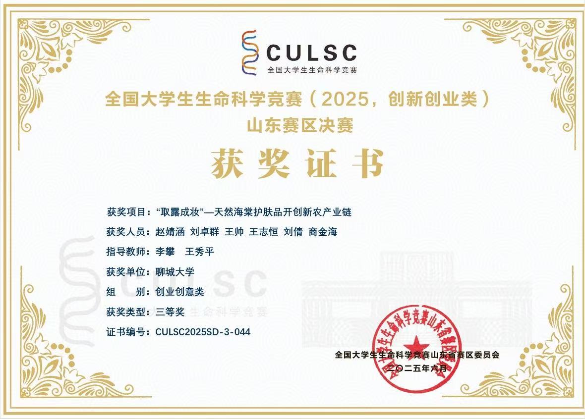 热烈祝贺ok138太阳集团王志恒荣获全国大学生生命科学竞赛(2025,创新创业类)山东赛区决赛三等奖