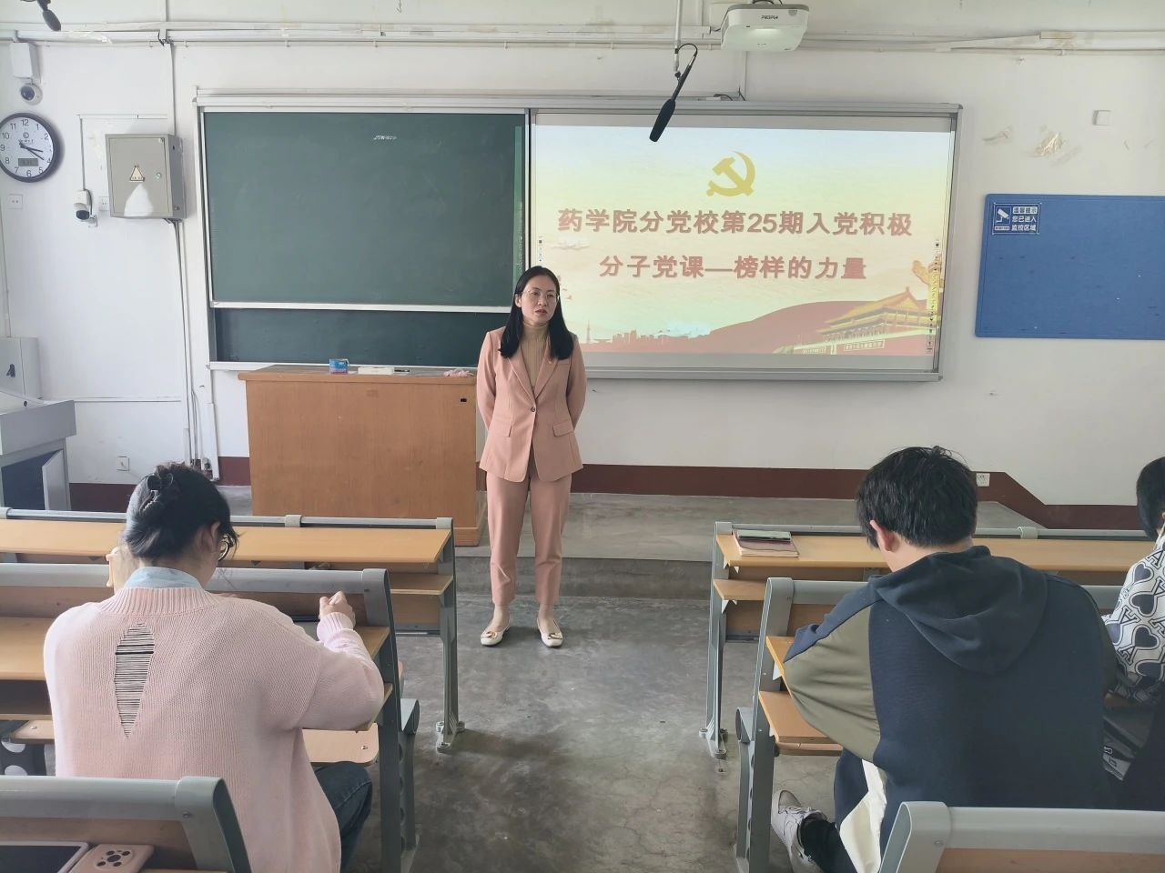 本次会议以“榜样的力量”为出发点,王秀平通过播放影片《黄大年》以加深入党积极分子对榜样力量的理解。黄大年同志终生将国家利益、民族荣誉置于首位,不断探索创新,为国家科技事业发展贡献力量。影片展现的榜样力量不仅体现在个人英雄主义,更深深扎根于中华民族伟大复兴理想的家国情怀。王秀平指出,当下,作为青年先进分子,更需怀揣家国情怀,建立正确人生观、世界观与价值观,明确责任使命,勇于承担社会责任,努力学习,不断进取,为实现中华民族伟大复兴的中国梦贡献青春力量。