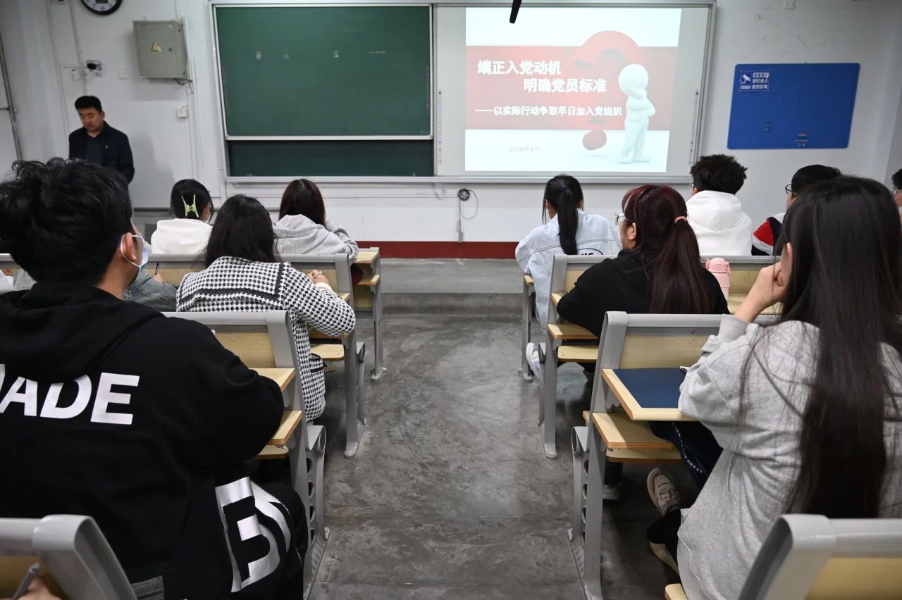 李永新从“什么是入党动机、如何端正入党动机、明确党员标准、入党秩序、以实际行动入党”五个主要方面进行讲解,结合毛泽东、钱学森等人入党的事迹,告诫学生们要在学深悟透波澜壮阔的辉煌党史中,学习先进党员在推动党的发展中的先进精神事迹,笃定信仰,厚植爱党爱国情怀,同时向入党积极分子提出三点要求:一是要带着理想去学习,坚定理想信念,淬炼入党初心;二是要提高自己的综合素质,德智体美劳全面发展,在各方面积极向党组织靠拢;三是要锻炼自己的身体,磨炼自己的意志,成为能够为国家贡献青春力量的有用之才,并号召入党积极分子端正入党动机,按照党员的标准严格要求自己,脚踏实地,能够将所学所悟践行到日常所行之中。
