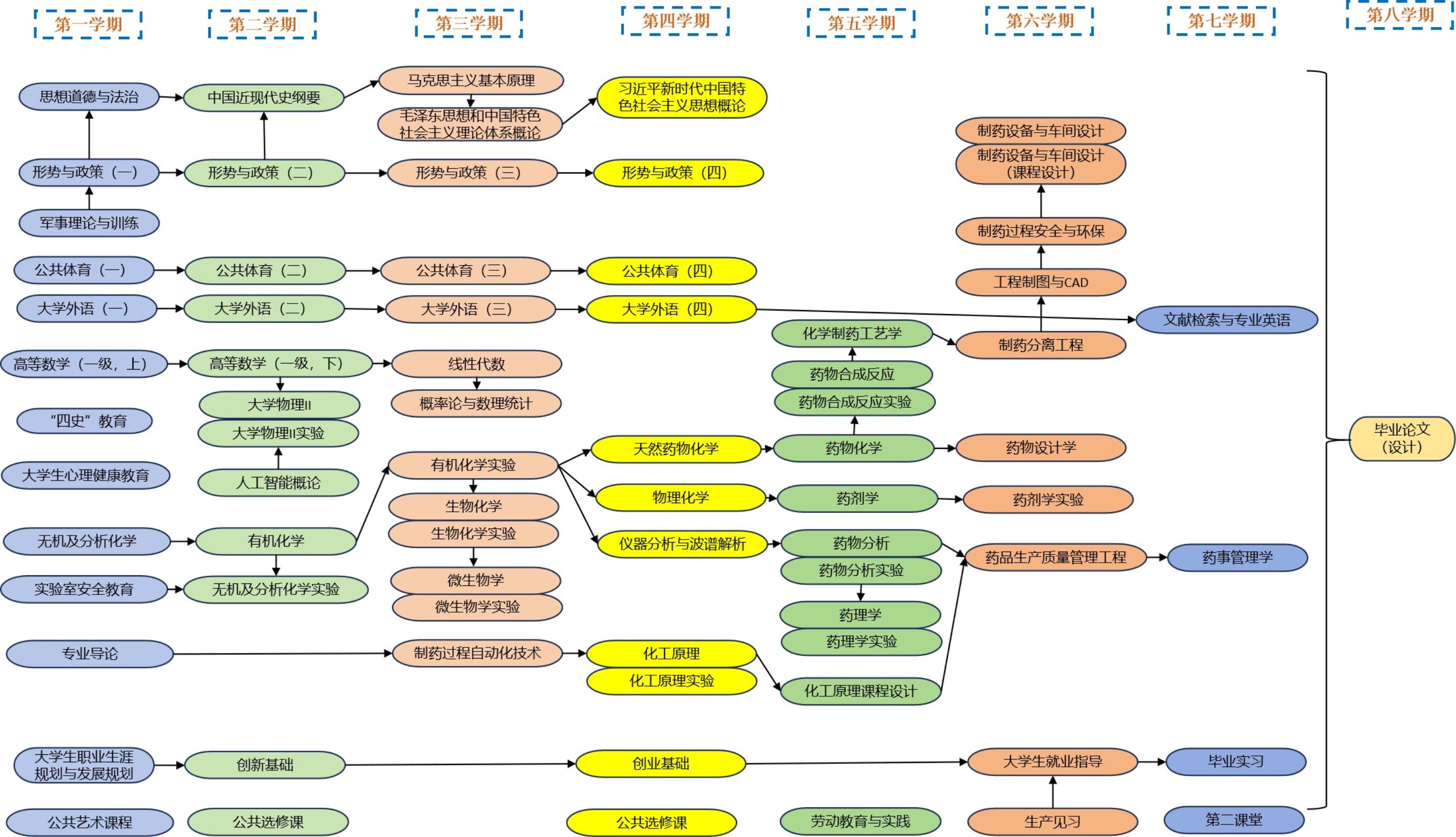 主要课程:高等数学、线性代数、无机及分析化学、大学物理、有机化学、工程制图与CAD、化工原理、物理化学、制药过程自动化技术、药物合成反应、生物化学、药物化学、药物分析、药理学、药剂学、制药设备与车间设计、制药过程安全与环保、化学制药工艺学、药品生产质量管理工程等。