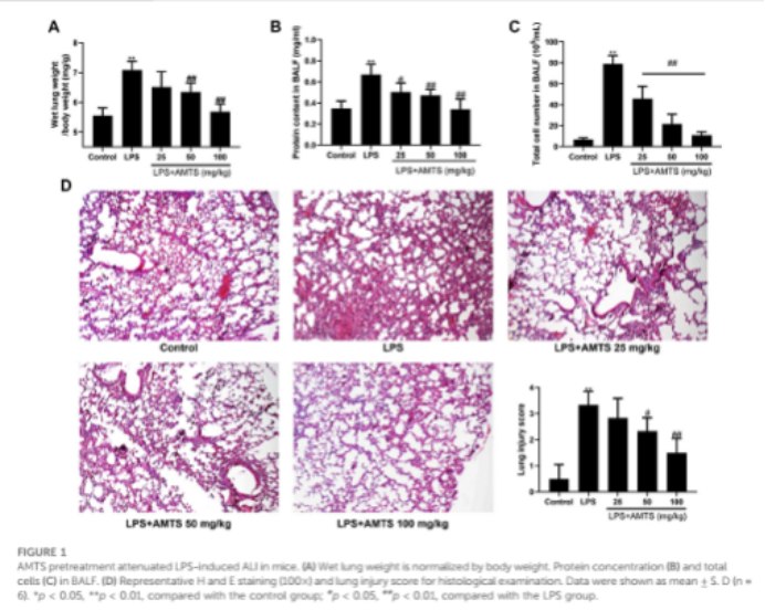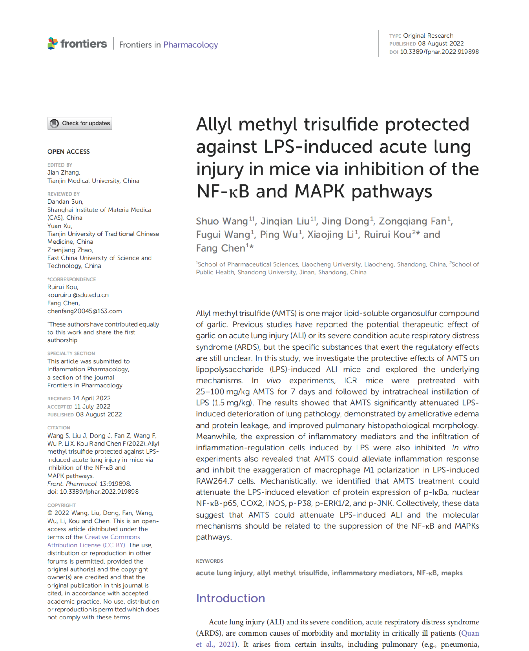 近日,药学院合成生物学与化学生物学创新团队的陈芳教授和王硕博士在《Frontiers in Pharmacology》杂志(中科院二区Top,IF=5.988)发表以“Allyl methyl trisulfide protected against LPS-induced acute lung injury in mice via inhibition of the NF-κB and MAPK pathways”为题的研究成果。王硕博士、硕士生刘晋倩为本论文的共同第一作者,陈芳教授和山东大学寇蕊蕊教授为共同通讯作者,OK138太阳集团为第一署名单位。