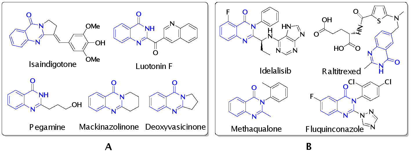 图2. 含有喹唑啉酮结构的天然产物(A)及开发成功的药物(B)