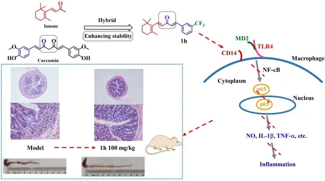来源于中药姜黄中的姜黄素,是抗癌、抗炎药物中的明星分子,该团队以姜黄素为先导化合物,通过分子杂合策略,基于电子效应和取代基的位置效应,设计合成一系列的β-紫罗兰酮-姜黄素杂合衍生物。通过机制研究发现,β-紫罗兰酮-姜黄素杂合衍生物通过抑制NO和活性氧的产生、白细胞介素-1β和肿瘤坏死因子-α的表达以及核因子(NF)-κB从胞浆向细胞核的移位而显示出抗炎活性。该类药物可显著减少DSS诱导的UC小鼠结肠长度缩短,并保护其免受结肠损伤、肝损伤和氧化应激,并具有体内安全性,是潜在的抗炎剂。该成果以Anti-inflammatory effects of β-ionone-curcumin hybrid derivatives against ulcerative colitis为题发表在发表在《Chem-Biol Interact.》(2022, 367, 11018)。为进一步提升该类药物的生物利用度,该团队通过制备牛血清白蛋白(BSA)纳米粒,实现该类药物更易吸收并靶向聚集于肝脏中,提高对急性肝损伤的保护作用。该成果以Hepatoprotective Effects of Albumin-Encapsulated Nanoparticles of a Curcumin Derivative COP-22 against Lipopolysaccharide/D -Galactosamine-Induced Acute Liver Injury in Mice为题发表在发表在《Int. J Mol. Sci.》(2022, 23, 4903)。