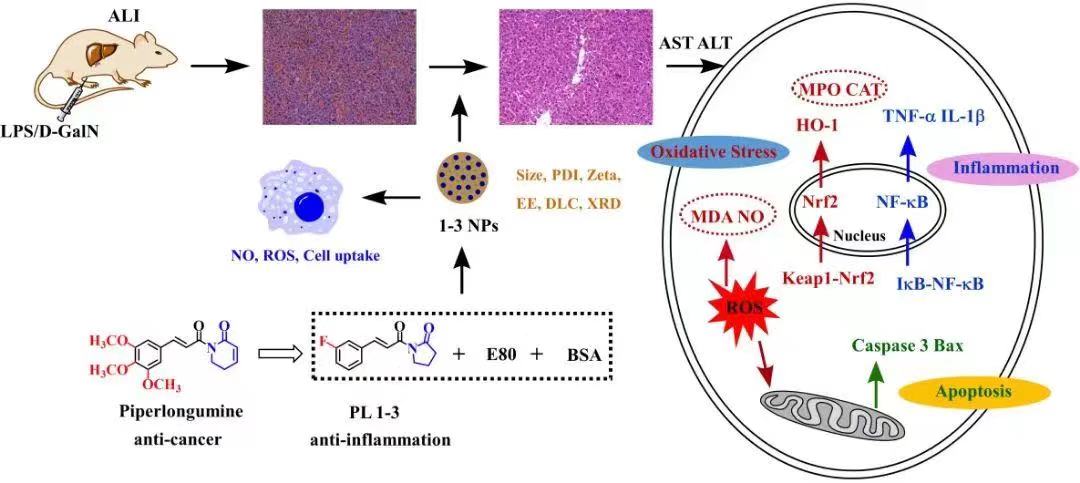 此外,该团队还聚焦中药植物荜茇中的活性成分-荜茇酰胺,通过结构修饰,制备并表征了PL 1-3负载的牛血清白蛋白纳米颗粒(1-3 NP)。机制研究表明,1-3 NP治疗可通过下调NF-κB信号通路、激活Nrf2/HO-1信号通路以及抑制Bax和caspase-3蛋白的表达来抑制炎症、氧化应激和凋亡,实现对脂多糖/d-氨基半乳糖诱导的小鼠急性肝损伤的保护作用。该成果以Evaluation of Hepatoprotective Effects of Piperlongumine Derivative PL 1−3-Loaded Albumin Nanoparticles on Lipopolysaccharide/DGalactosamine-Induced Acute Liver Injury in Mice为题发表在《Mol. Pharmaceut.》(2022, 19, 4576-4587)。