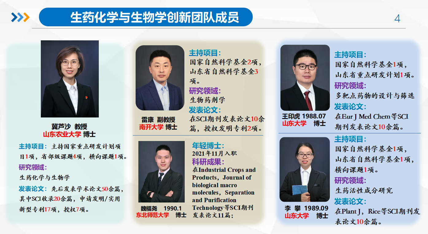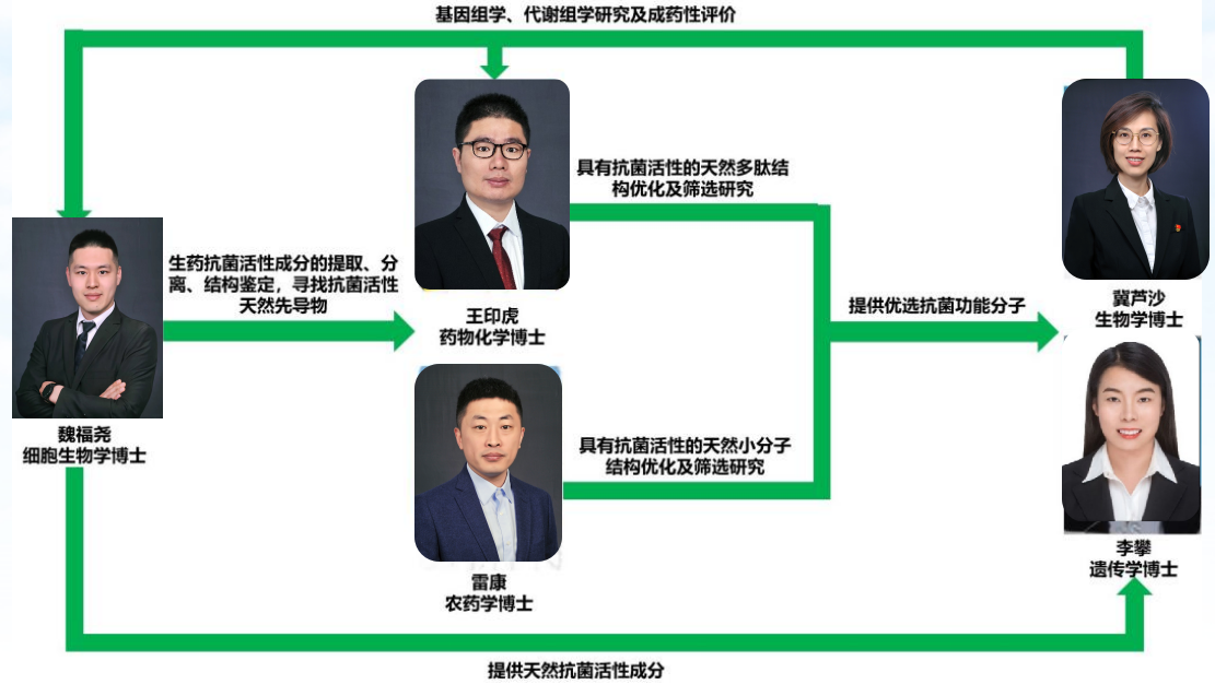 团队主要成员均毕业于国内985,211高校,由各个学科领域的优秀博士组成。目前团队中的核心成员有教授1名,副教授1名,讲师3名。其中,魏福尧博士主要从事具有抗菌活性的天然产物提取、分离、结构鉴定工作;雷康、王印虎博士主要从事具有抗菌活性天然小分子及天然多肽的修饰及筛选工作;冀芦沙,李攀博士主要从事天然先导分子及优选分子的代谢组学、基因组学、药理学、毒理学研究及成药性评价工作。本团队各成员的研究工作环环相扣,通过彼此学科优势互补,达到人尽其才,物尽其用。