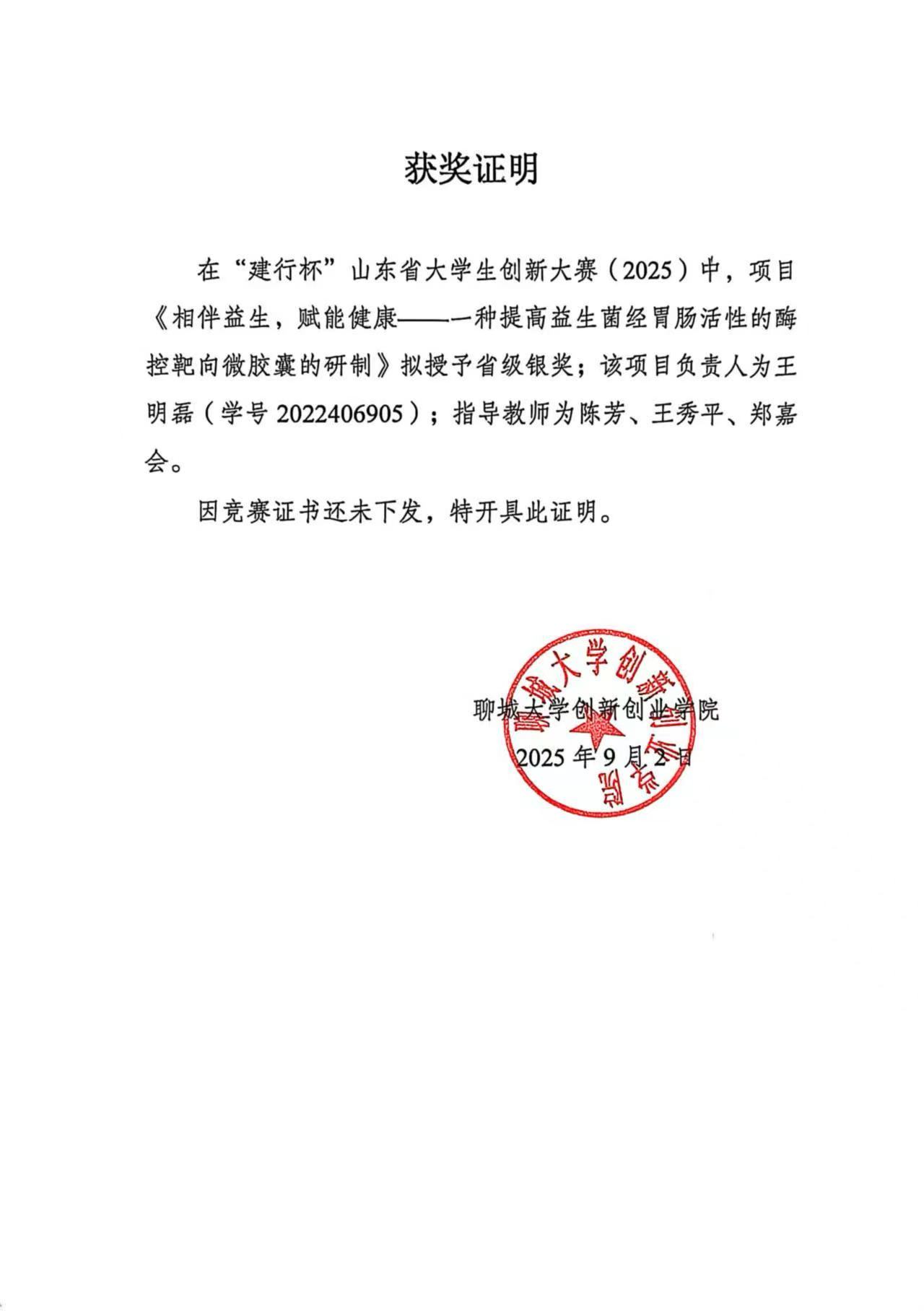 热烈祝贺ok138太阳集团张家硕荣获”建行杯”山东省大学生创新大赛(2025)省级银奖