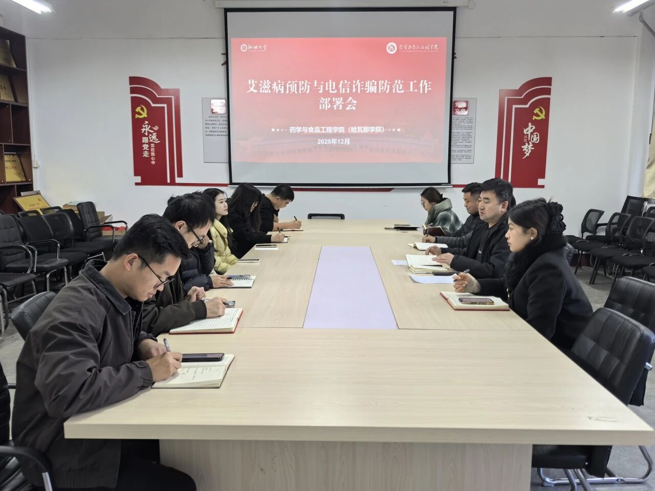 为筑牢校园安全防护网,在第38个“世界艾滋病日”宣传期间,我院于12月3日在会议室召开专题工作会议,就艾滋病预防教育与电信诈骗防范工作进行全面部署。学院党委副书记、副院长李永新,全体班主任及专职辅导员参加会议,会议由学院团委书记郑嘉会主持。
