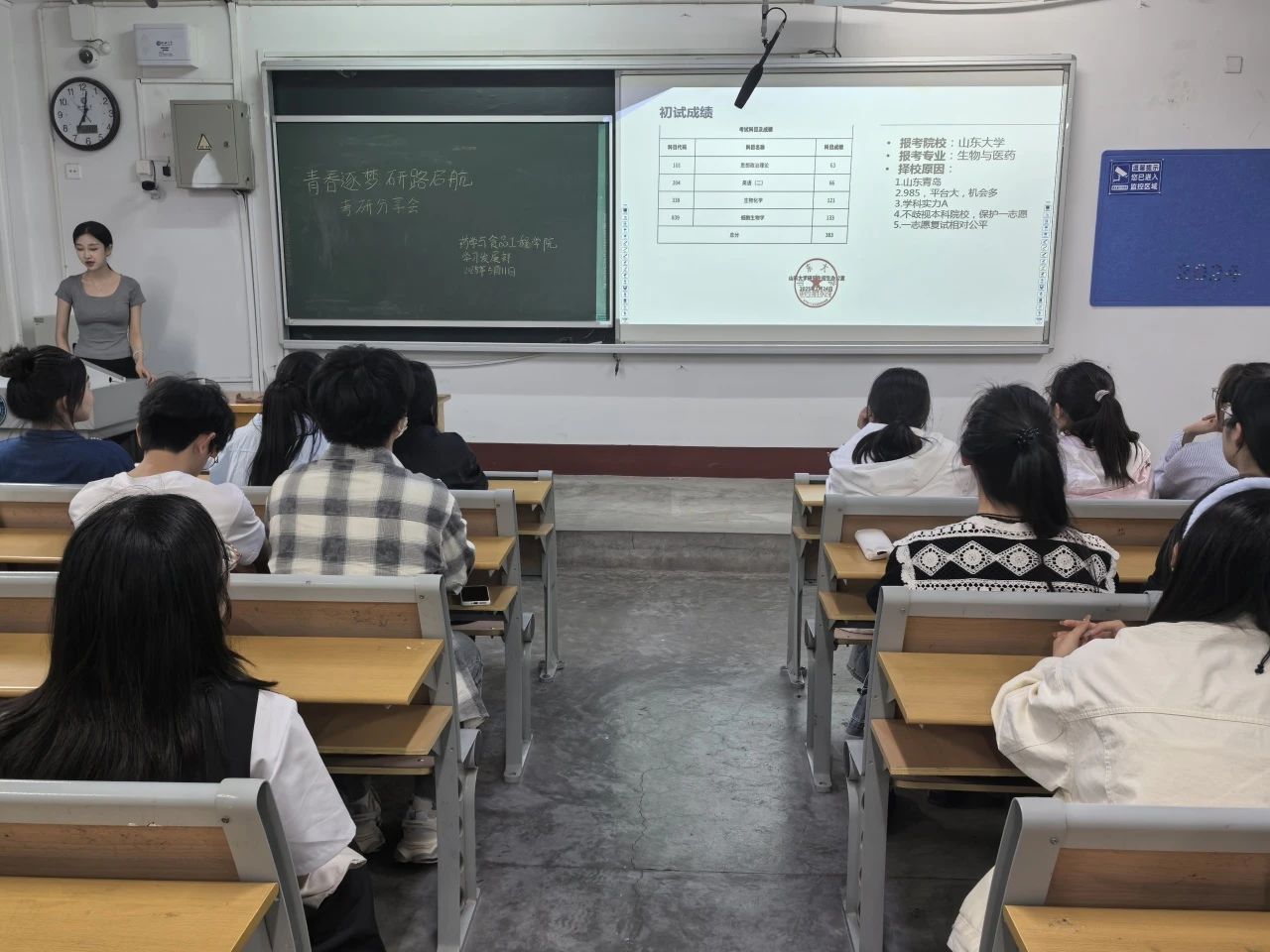活动伊始,李涵玉分享她的考研历程,她强调英语学习中单词积累的重要性,学生要在阅读和例句中理解单词含义。此外,她还提到心态调整的关键,要每周适当休息,保持学习动力。李晓雨则建议学生在择校时综合考虑学校层次、专业学习、调剂情况等多方面因素,选择二至三个意向院校,为考研之路增加更多可能性。随后,秦春慧讲述她在政治学习中的技巧,推荐学生利用小程序刷选择题的方法,充分利用碎片化时间。程磊提醒学生不要因缺乏科研经历而过度焦虑,复试时老师更看重的是对实验课知识的掌握程度。娄静怡结合自身跨专业考研经历,建议学生制定合理的学习计划、提高学习效率,后期进行全真模拟以适应考试节奏。活动结束后,同学们纷纷表示收获颇丰,不仅学习到了实用的复习方法和技巧,还明确了专业选择和努力的方向,在未来的考研路上,一定会坚持不懈,实现自己的理想目标。