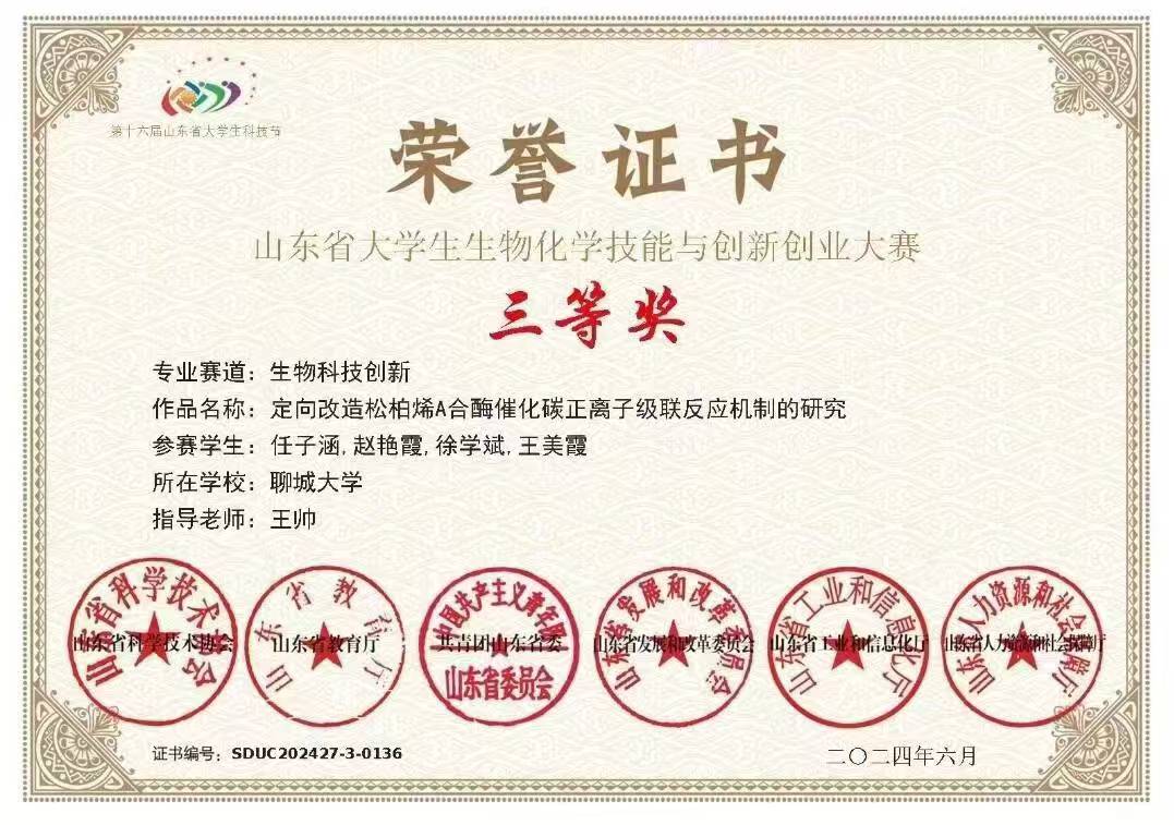 热烈祝贺ok138太阳集团王美霞荣获“山东省大学生生物化学技能与创新创业大赛(2024,创新创业类)”二等奖