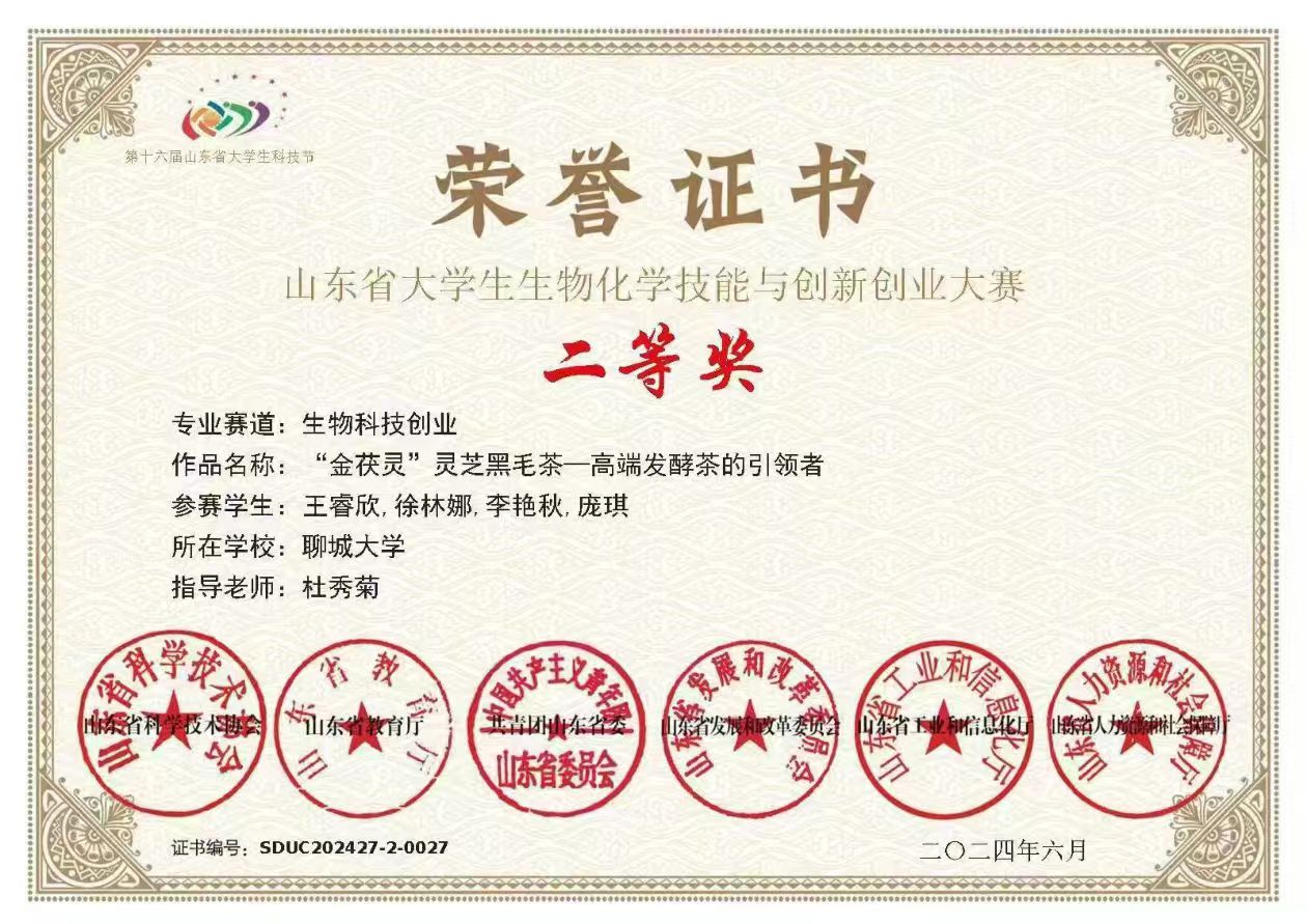 热烈祝贺ok138太阳集团李艳秋荣获“山东省大学生生物化学技能与创新创业大赛(2024,创新创业类)”二等奖