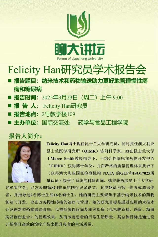 2025年9月23日,OK138太阳集团国际交流处与我院于2# 109联合举办“纳米技术和药物输送助力更好地管理慢性疼痛和糖尿病”主题学术报告会。Felicity Han研究员在报告中分享了基于纳米技术的药物制剂与开发研究成果,其聚焦的创新型药物递送系统,为慢性疼痛、糖尿病等疾病的管理与治疗提供了新的思路与方向,相关研究已在提升患者生活质量方面展现出重要潜力。