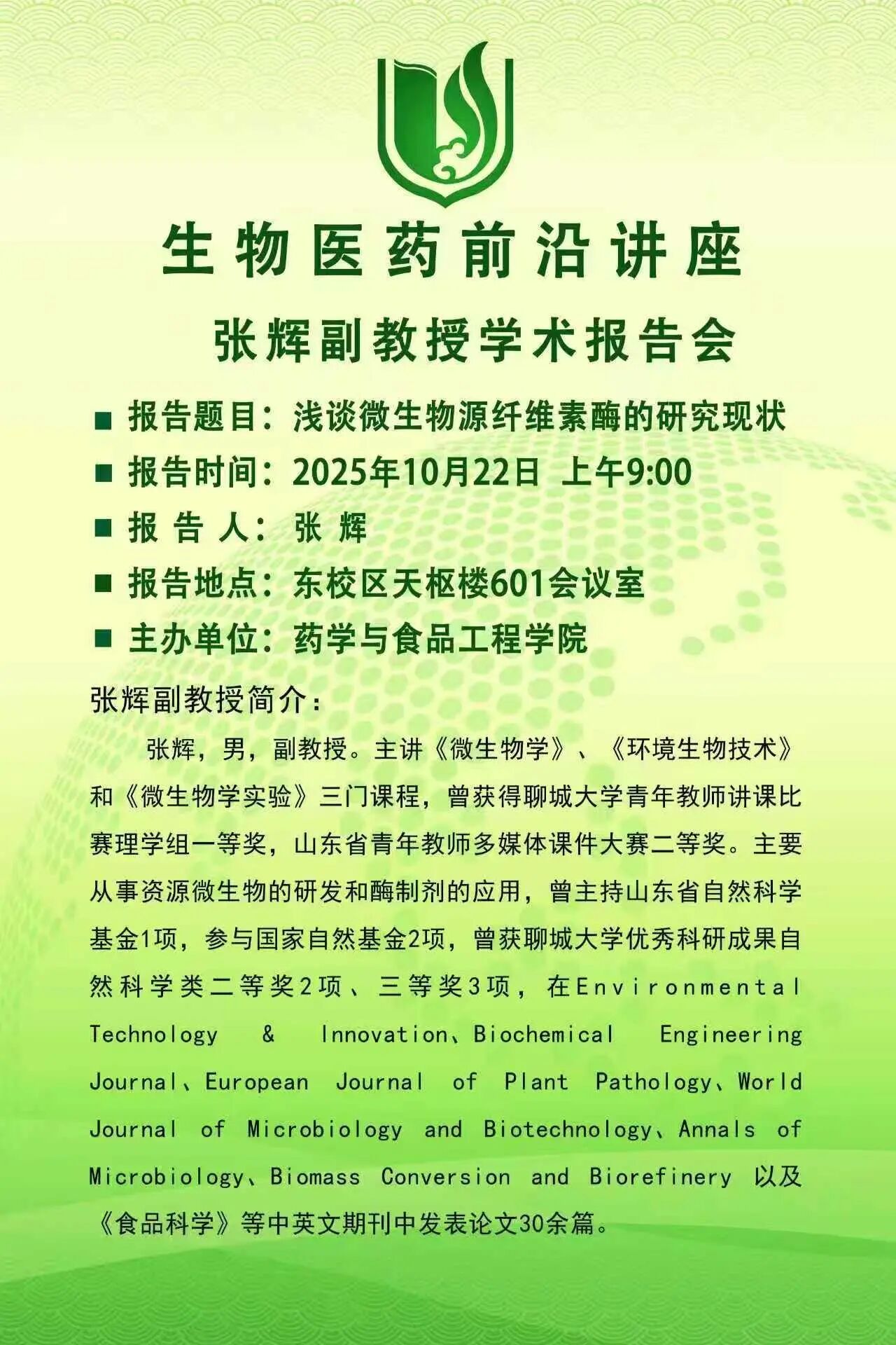 2025年10月22日,我院于东校区天枢楼# 601举办“浅谈微生物源纤维素酶的研究现状”主题学术报告会。张辉副教授在报告中梳理了微生物源纤维素酶的研发与应用现状,分享了其在资源微生物研发、酶制剂应用领域的研究成果与实践经验,为相关领域的科研与产业应用提供了重要的参考依据。