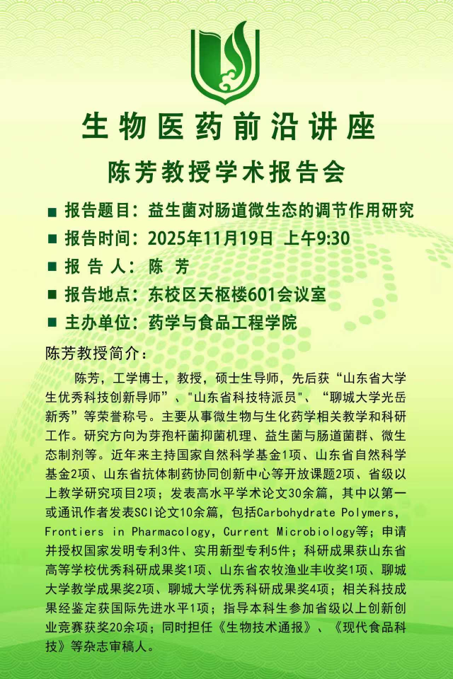 2025年11月19日,我院于东校区天枢楼# 601举办“益生菌对肠道微生物的调节作用研究”主题学术报告会,陈芳教授阐述了特定益生菌可通过重塑肠道菌群结构、增强肠道屏障功能等途径改善肠道微生态失衡,相关研究不仅为益生菌制剂的开发提供了实验依据,也为肠道相关疾病的营养干预提供了新方向。