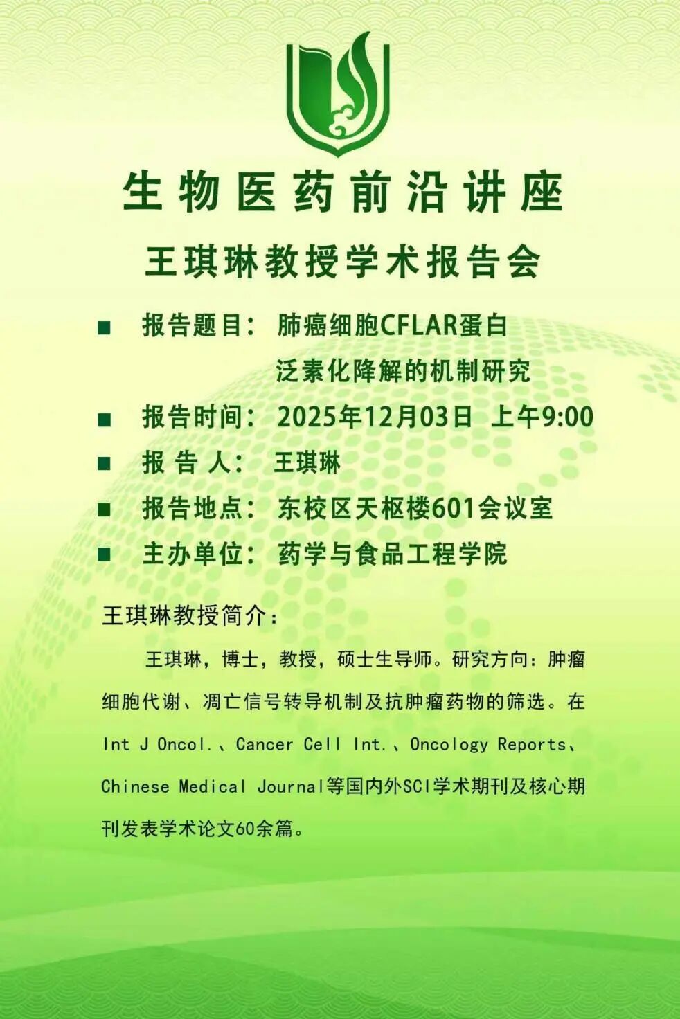 2025年12月3日,我院于东校区天枢楼# 601会议室举办“肺癌细胞CFLAR蛋白泛素化降解的机制研究”主题学术报告会。王琪琳教授的报告指出了CFLAR蛋白在非小细胞肺癌细胞凋亡调控中的关键作用及其通过泛素化途径降解的分子机制。揭示了其在肿瘤细胞代谢与凋亡信号转导中的重要作用,为肺癌靶向治疗提供了新的研究方向与潜在药物靶点。