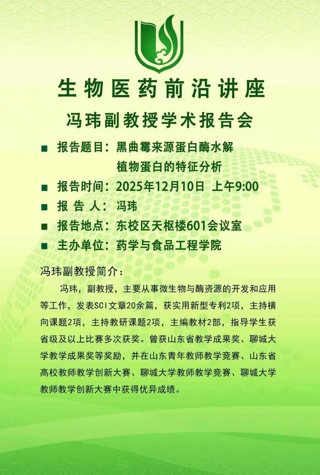 2025年12月10日,我院于东校区天枢楼# 601举办“黑曲霉来源蛋白酶水解植物蛋白的特征分析”主题学术报告会。冯玮副教授系统阐述了黑曲霉蛋白水解酶系的挖掘、鉴定、功能解析及其在植物蛋白可控水解中的应用研究。通过酶的组合优化,实现了对大豆分离蛋白的高效、可控水解,为植物蛋白的精深加工与高值化利用提供了重要的酶工具与理论依据。