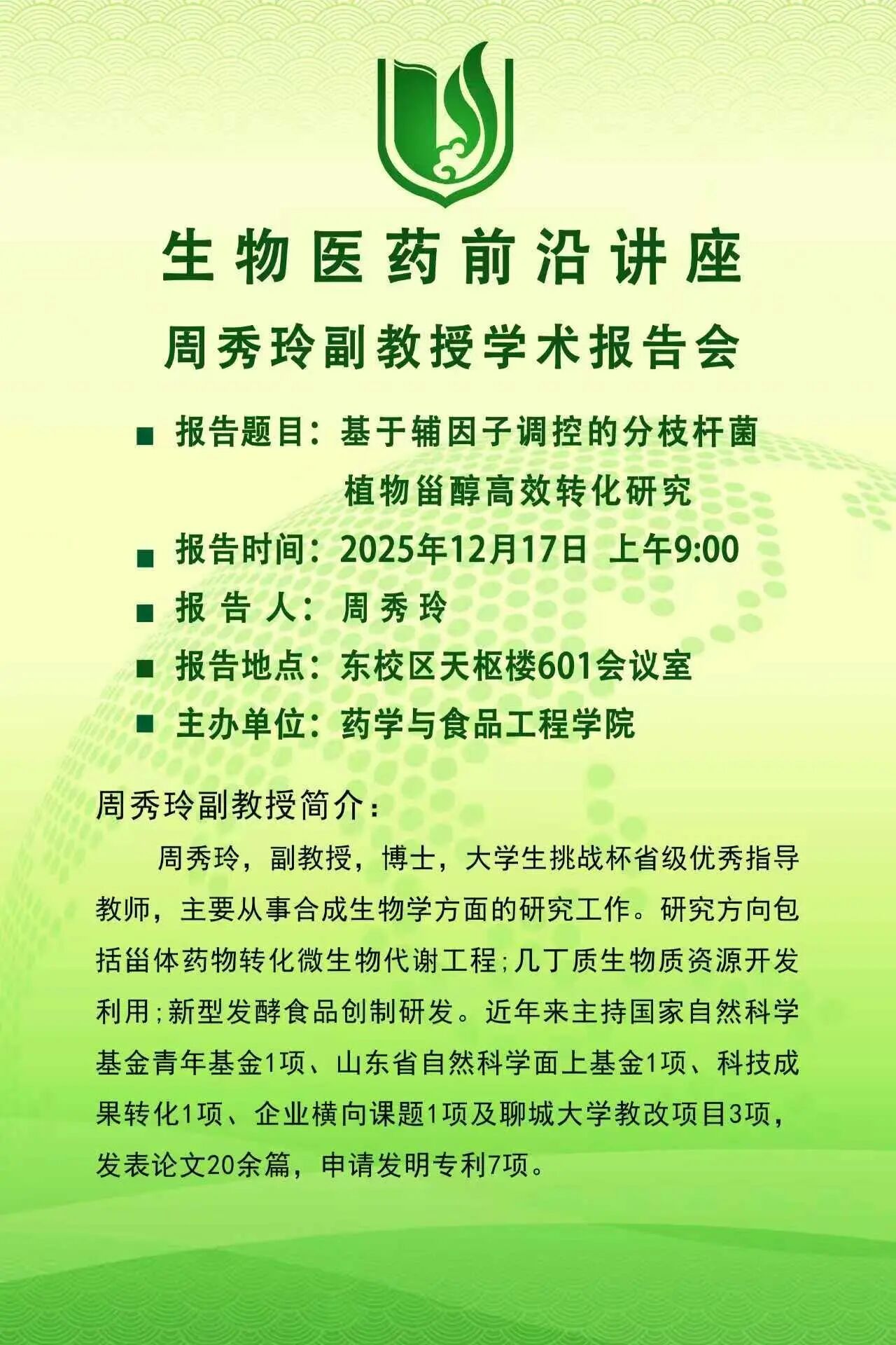 2025年12月17日,我院于东校区天枢楼# 601举办“基于辅因子调控的分枝杆菌植物甾醇高效转化研究”主题学术报告会。周秀玲副教授的报告深入探讨了通过辅因子工程策略提升新金分枝杆菌转化植物甾醇合成雄烯二酮的效率的机制,减少雄二烯二酮等副产物的产生,为甾体类药物前体的绿色生物制造提供了新思路。