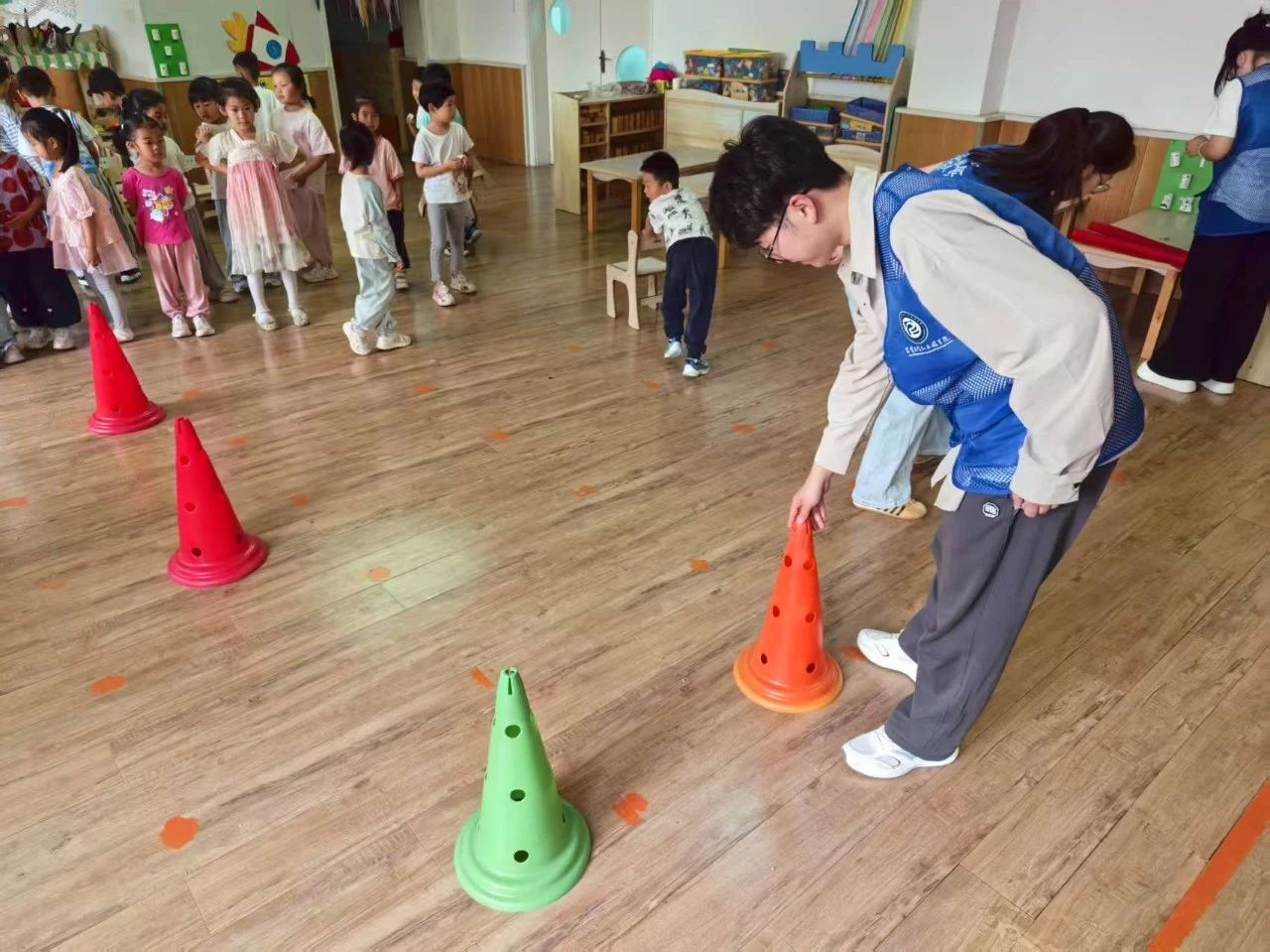 活动伊始,团队成员以生动童趣的语言,围绕地震、火灾等常见灾害,从灾害表现形式、危害及应对策略展开深入浅出的讲解。逃生实践环节,团队成员为小朋友准备了火灾、地震模拟逃生游戏。在逃生实践环节,团队利用红色幅条、交通锥等道具精心搭建模拟场景。随着消防警报拉响,小朋友们迅速低头弯腰、捂住口鼻,灵活绕过交通锥模拟的障碍物,沿着红色幅条指引的路线有序撤离至“安全出口”,将理论知识转化为实际行动。地震逃生模拟中,听到防空警报后,小朋友迅速寻找墙角、桌底等安全区域,规范完成“蹲下、掩护、抓牢”整套避险动作,展现出良好的学习成效。互动问答环节,团队精心设计的防灾知识竞答题目引发热烈反响,小朋友踊跃举手、积极抢答,现场气氛热烈。