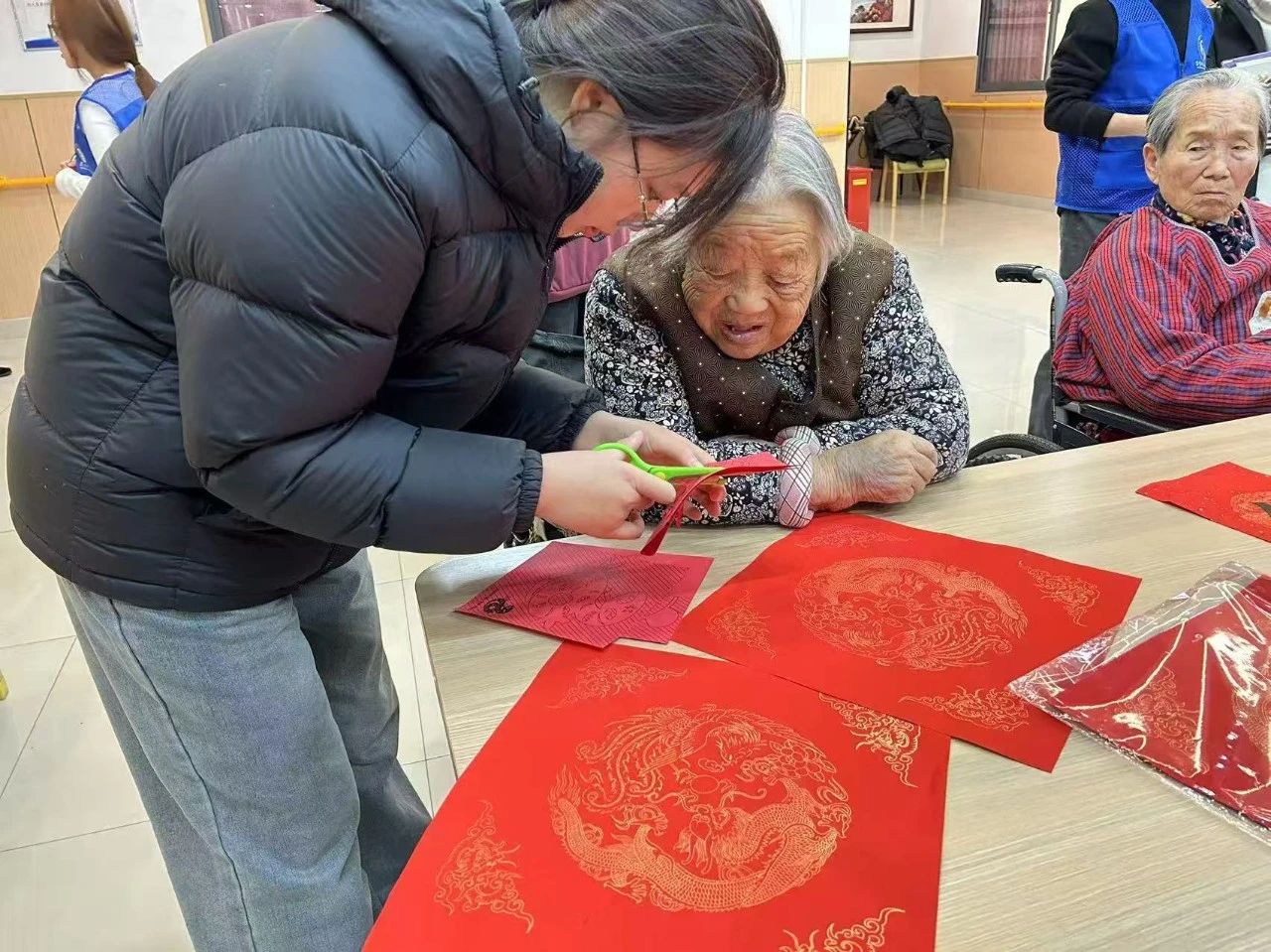 在活动过程中,团队成员给老人们分发提前准备好的毛笔、红宣纸、窗花剪纸以及剪刀。他们将对新春的祝福融入到每一个细节里。老人们相互交流、相互学习,共同完成福字窗花的制作,团队成员协助老人们创作的同时,和老人们交流分享生活中的趣事,气氛温馨热闹。在团队成员的协助下,老人们顺利完成了自己的创作,并相互展示自己的作品。活动结束后,团队成员纷纷表示通过参与福字窗花制作,让他们深刻体会到关爱老人的意义,今后会更多地参与此类活动,用实际行动传递温暖。