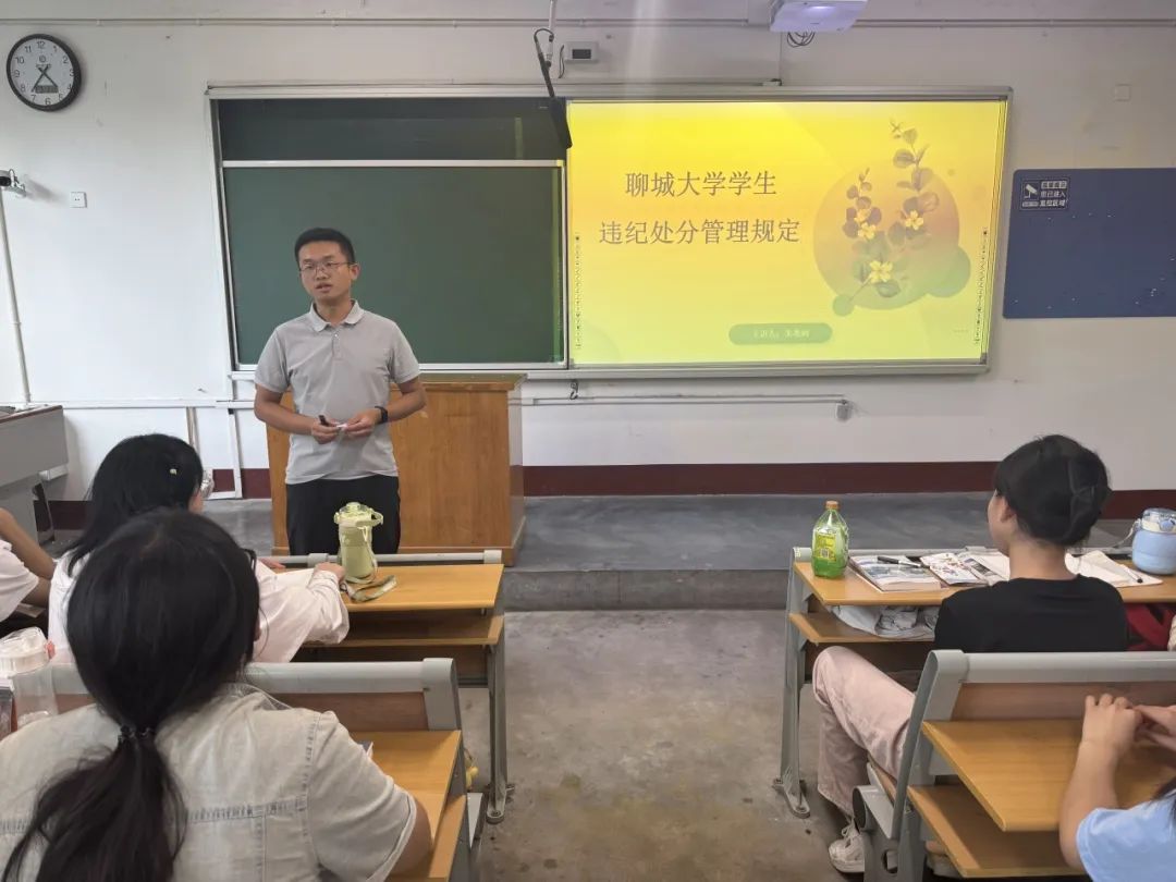 为加强我院学生的教育与管理工作,进一步完善学生管理规章制度体系,帮助新生更好的适应大学生活,9月2日,我院于OK138太阳集团东校区2#209举办2024级新生违纪处分管理规定入学教育,此次教育课由辅导员朱兆阔担任主讲人。