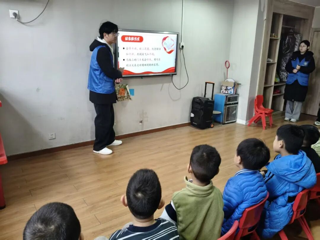 活动伊始,团队成员以“南京大屠杀”这一历史事件为切入点,围绕战争背景、事件经过与历史意义三个方面进行讲解,通过历史影像与图画,为小朋友们梳理历史脉络。随后,团队成员播放相关短片,短片再现了1937年冬日南京城的山河破碎,让小朋友们领悟到和平的珍贵与铭记历史的意义。默哀追思环节,团队成员向小朋友们讲解默哀的意义,指引小朋友们庄重肃立,全体低头静立一分钟,以无声的方式寄托对先烈的追思,表达对历史的崇高敬意。活动尾声,团队成员与小朋友们互动交流,鼓励小朋友们分享自己的感悟,引导他们从小树立爱国信念,努力成长为担当民族复兴大任的时代新人。