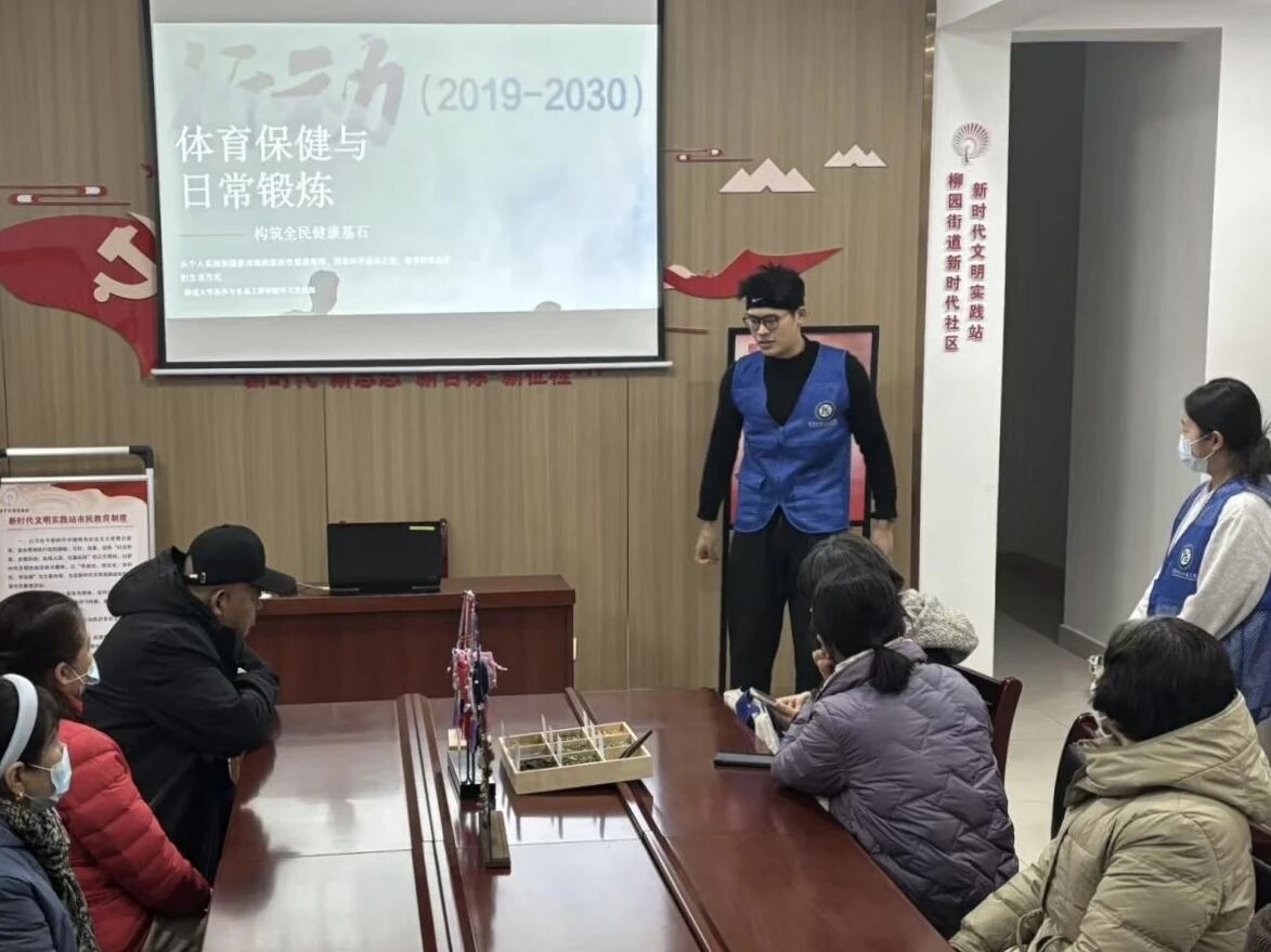活动伊始,团队成员结合不同年龄段居民的特点与运动需求,通过典型案例分析、知识要点梳理、现场动作指导等方式,系统介绍了健康的运动形式和常见风险的预防措施,团队成员还现场示范了科学热身的关键步骤,帮助居民掌握安全、有效的健身方法。随后,团队成员为老人们演示了一套专为老年人设计的韵律操,演示结束后,团队成员分组带领居民开展热身运动教学,耐心指导居民掌握动作要领,确保每位居民都能全面、规范地完成练习。最后,团队成员向居民发放运动健康知识手册,并通过问卷调查收集居民对活动内容与形式的意见建议,为后续优化实践方案提供参考。