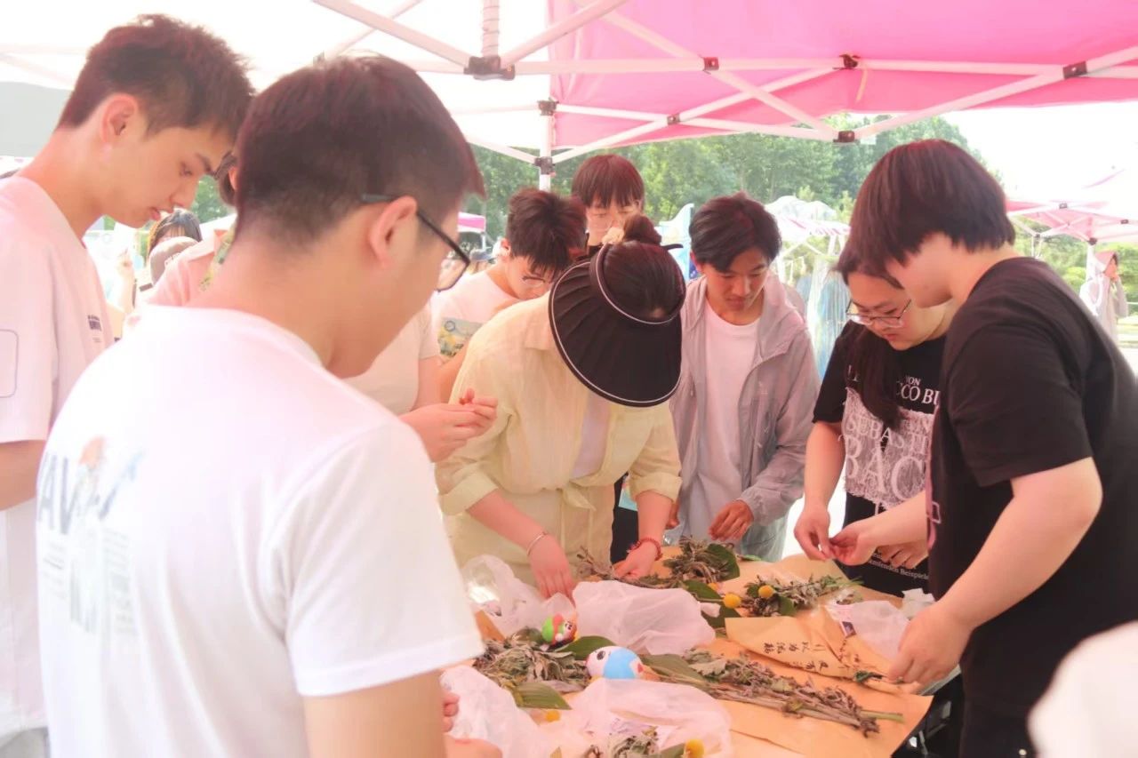 活动伊始,主持人紧扣端午节的文化主旨对本次活动进行了简单的介绍,并由学校领导进行了开幕式剪彩仪式。活动现场设有多个端午传统习俗活动展位,涵盖包粽子、福笺摇、雄黄绘、编彩绳等多个传统项目。我院精心设置了“艾草束”、“香韵集”特色摊位,摊位上摆放着精心准备的艾草材料和香料,学生们在专业指导下,专注地扎起艾草花束,调配香料制作香囊,每一件作品都饱含着对传统文化的敬意与热爱,吸引了众多参与者驻足观赏、亲身体验。