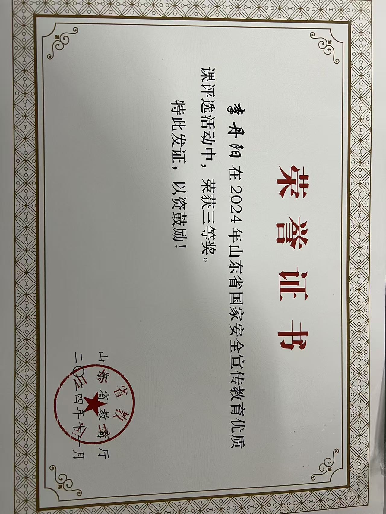 热烈祝贺ok138太阳集团李丹阳老师在2024年山东省国家安全宣讲教育优质课评选活动中,荣获三等奖