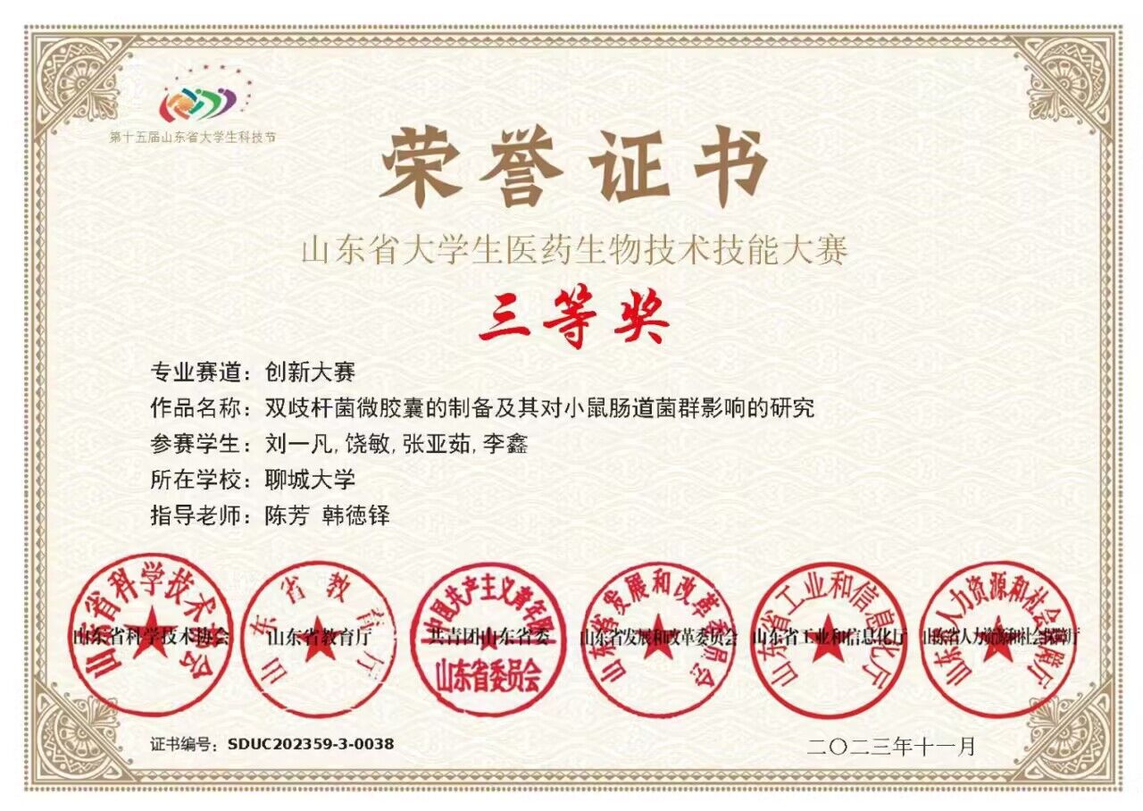 热烈祝贺药学院李鑫荣获“山东省大学生医药生物技术技能大赛”三等奖