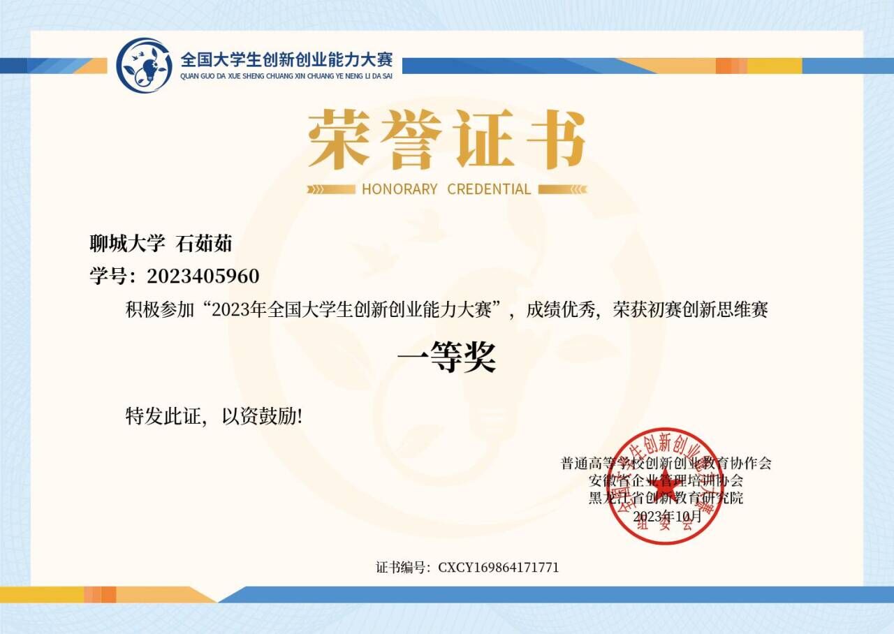热烈祝贺药学院石茹茹荣获“2023年全国大学生创新创业能力大赛”一等奖