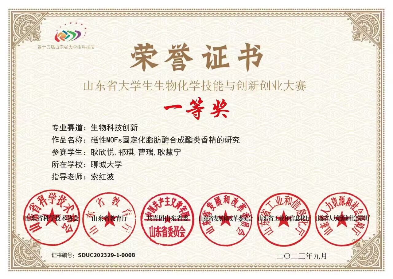 热烈祝贺药学院曹瑞荣获“山东省大学生生物化学技能与创新创业大赛”一等奖