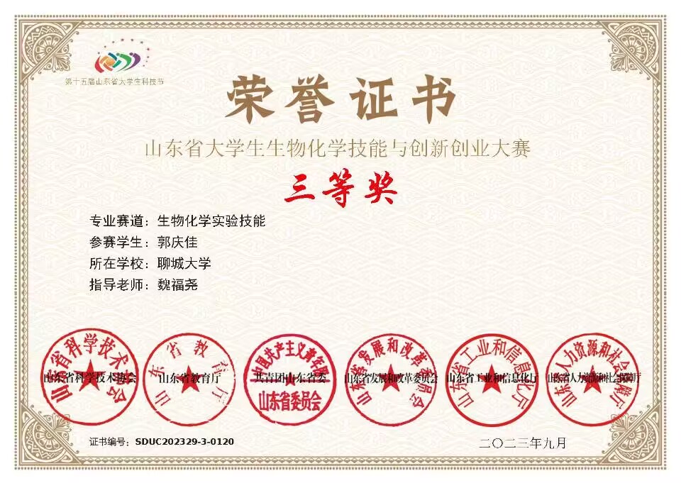 热烈祝贺药学院郭庆佳荣获“山东省大学生生物化学技能与创新创业大赛”三等奖