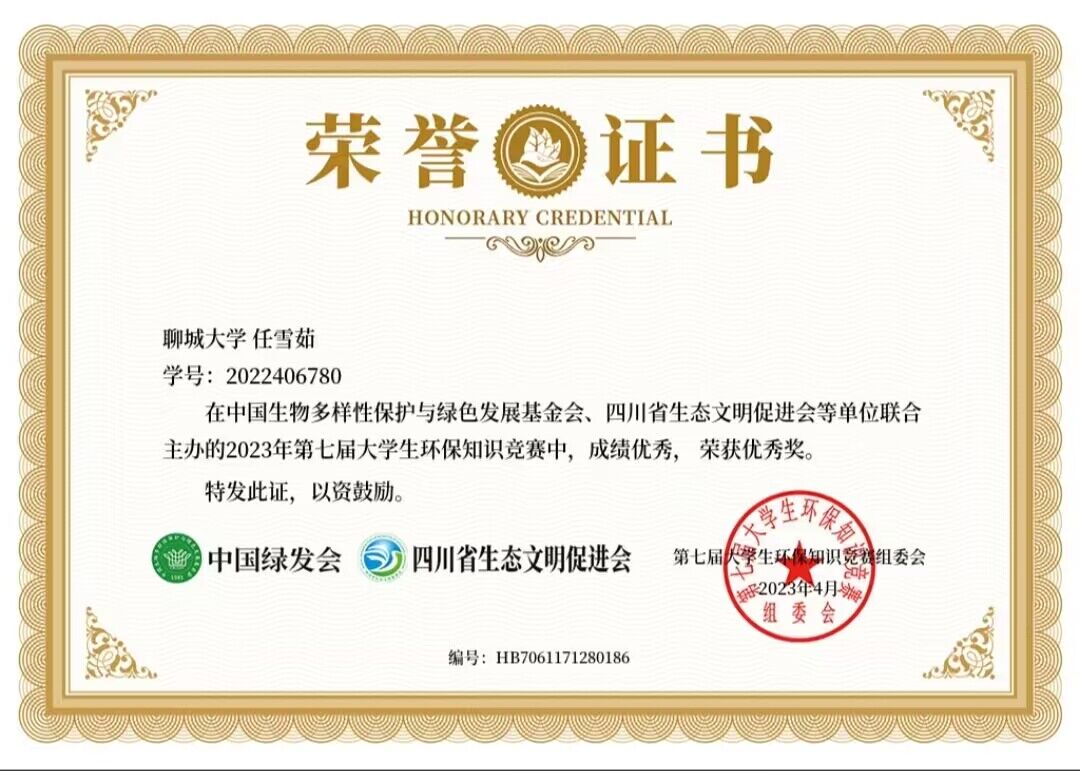 热烈祝贺药学院任雪茹荣获“第七届大学生环保知识竞赛”荣誉证书