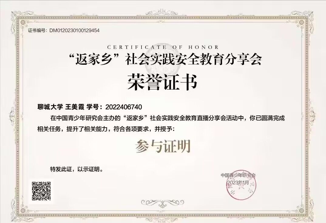 热烈祝贺药学院王美霞荣获“返家乡社会实践安全教育”荣誉证书