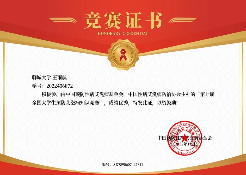 热烈祝贺药学院王雨航荣获“第七届全国大学生预防艾滋病知识竞赛”优秀奖