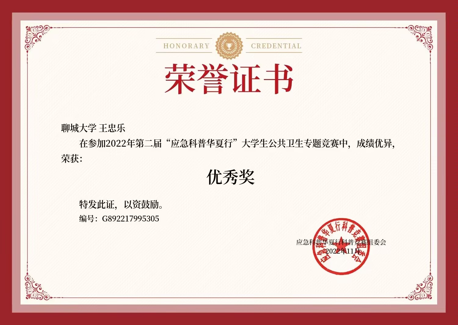热烈祝贺药学院王忠乐荣获“应急科普华夏行”大学生公共卫生专题竞赛优秀奖
