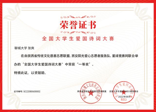 热烈祝贺药学院张爽荣获“全国大学生爱国诗词大赛”一等奖