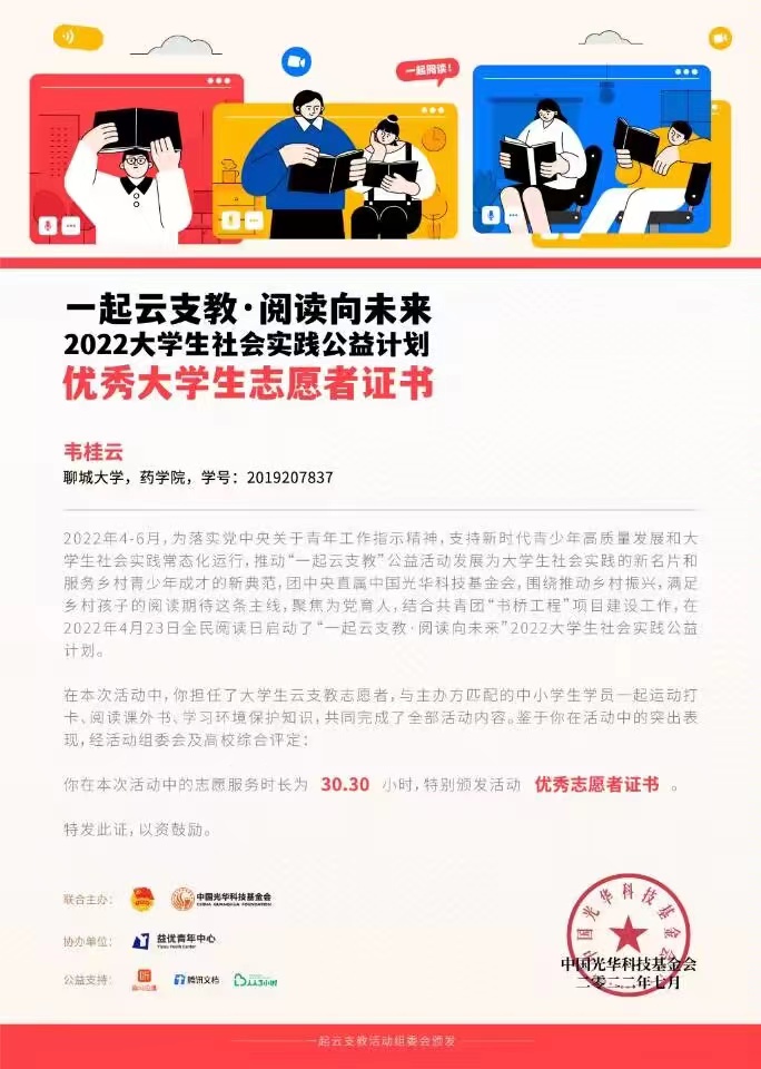 热烈祝贺药学院韦桂云荣获“一起云支教,阅读向未来”优秀大学学生志愿者证书