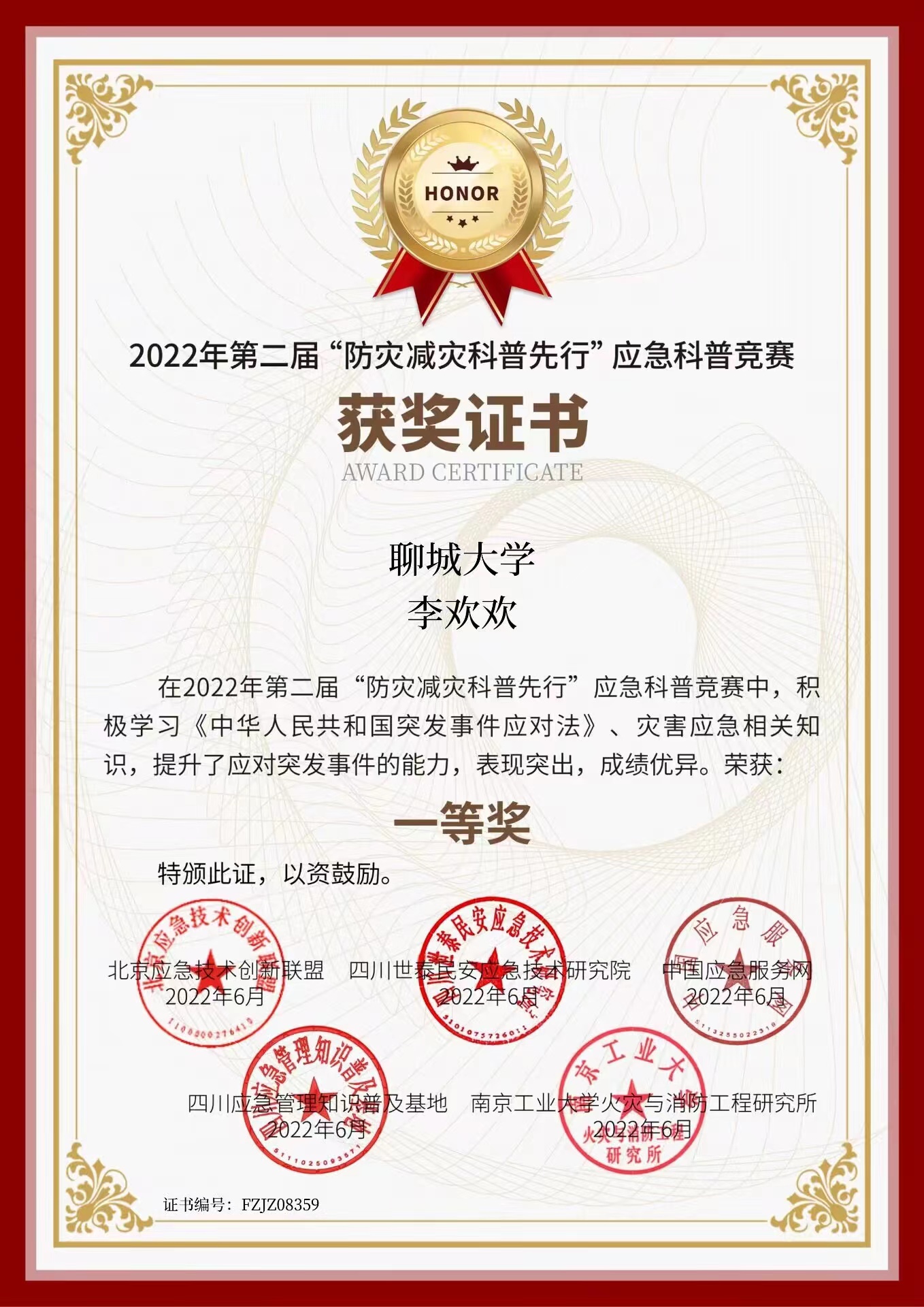热烈祝贺药学院李欢欢荣获第二届“防灾减灾科普先行”应急科普竞赛一等奖