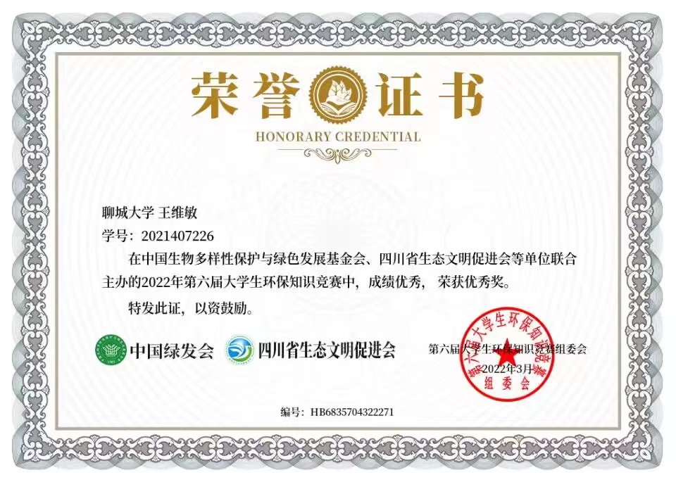 热烈祝贺药学院王维敏荣获“大学生环保知识竞赛”优秀奖