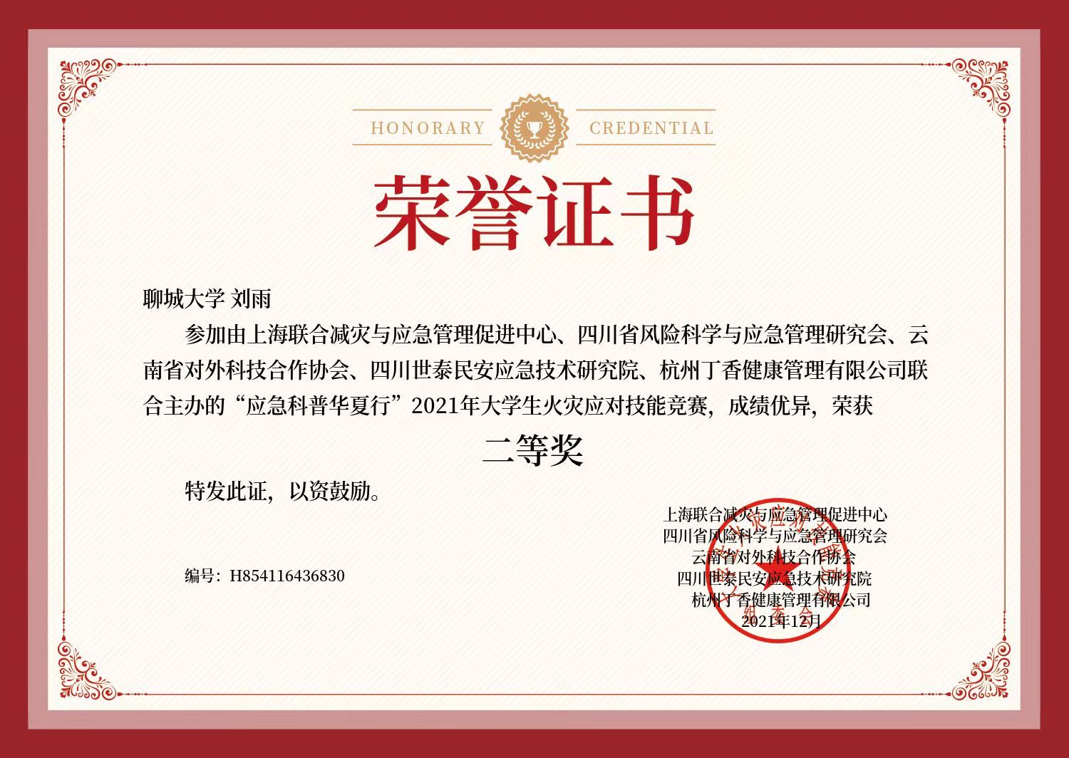 热烈祝贺药学院刘雨荣获“应急科普华夏行”2021年大学生火灾应对技能竞赛二等奖