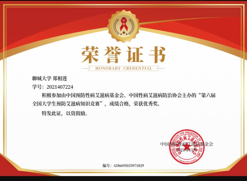 热烈祝贺药学院郑相莲荣获“第六届全国大学生预防艾滋病知识竞赛”优秀奖