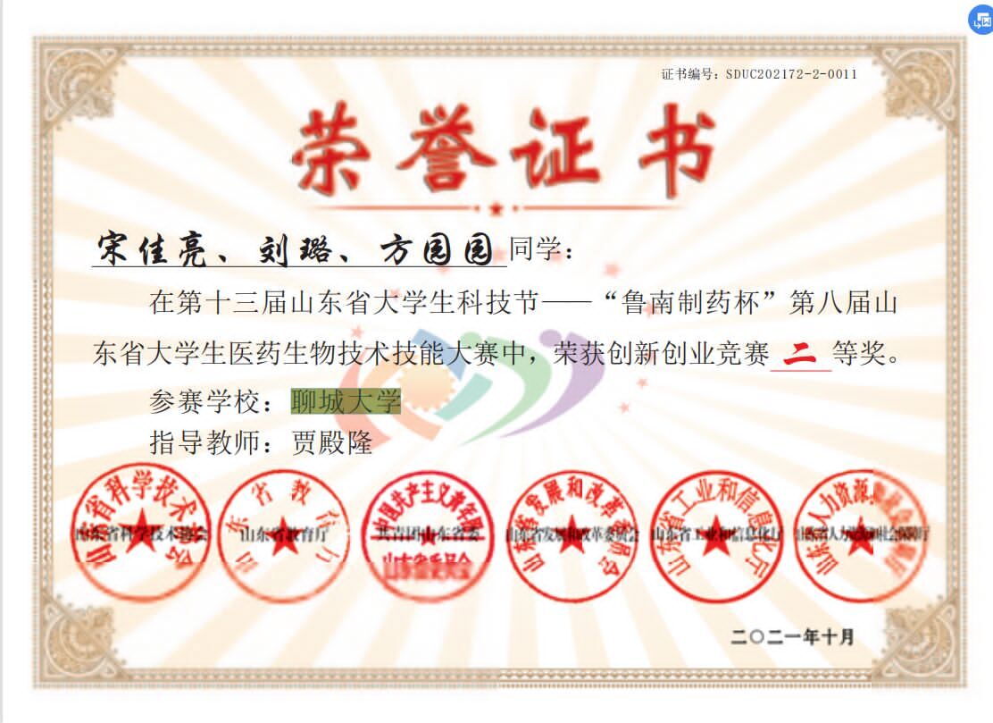 热烈祝贺药学院方园园荣获第十三届山东省大学生科技节“鲁南制药杯”第八届山东省大学生医药生物技术技能大赛创新创业竞赛二等奖