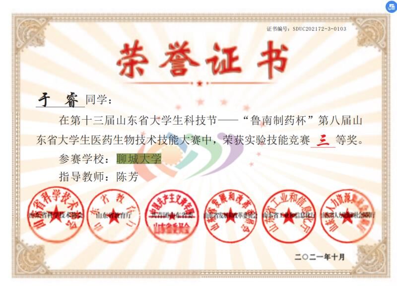 热烈祝贺药学院于睿荣获第十三届山东省大学生科技节“鲁南制药杯”第八届山东省大学生医药生物技术技能大赛实验技能竞赛三等奖
