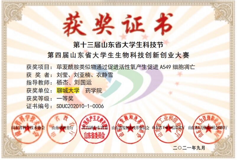 热烈祝贺药学院刘莹荣获第十三届山东省大学生科技节第四届山东省大学生生物科技创新创业大赛一等奖