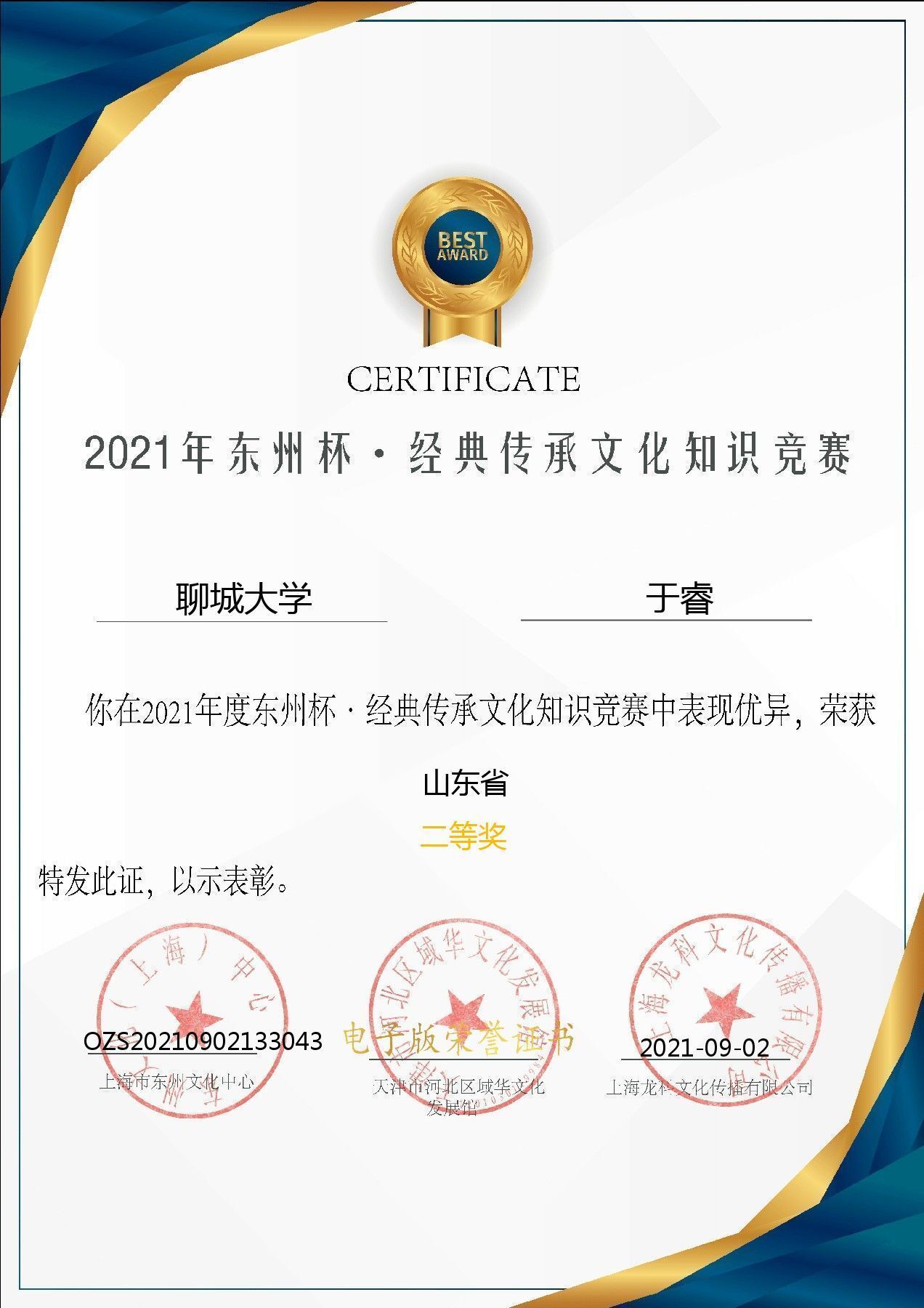 热烈祝贺药学院于睿荣获2021年东州杯·经典传承文化知识竞赛二等奖