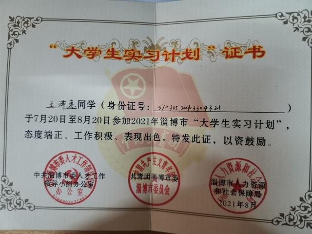 热烈祝贺药学院王泽惠荣获“大学生实习计划”证书