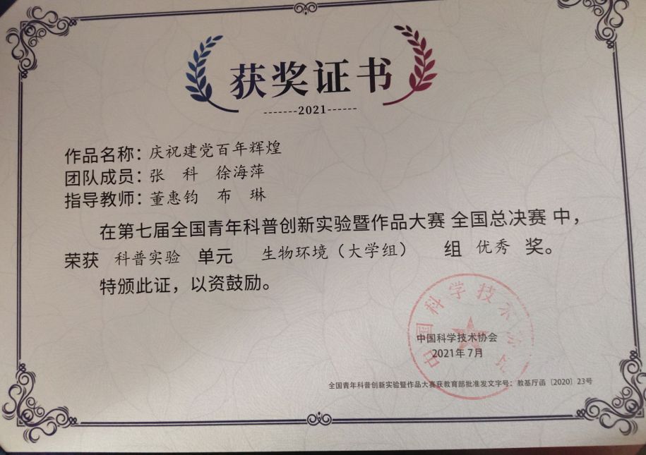热烈祝贺药学院徐海萍荣获第七届全国青年科普创新实验暨作品大赛优秀奖