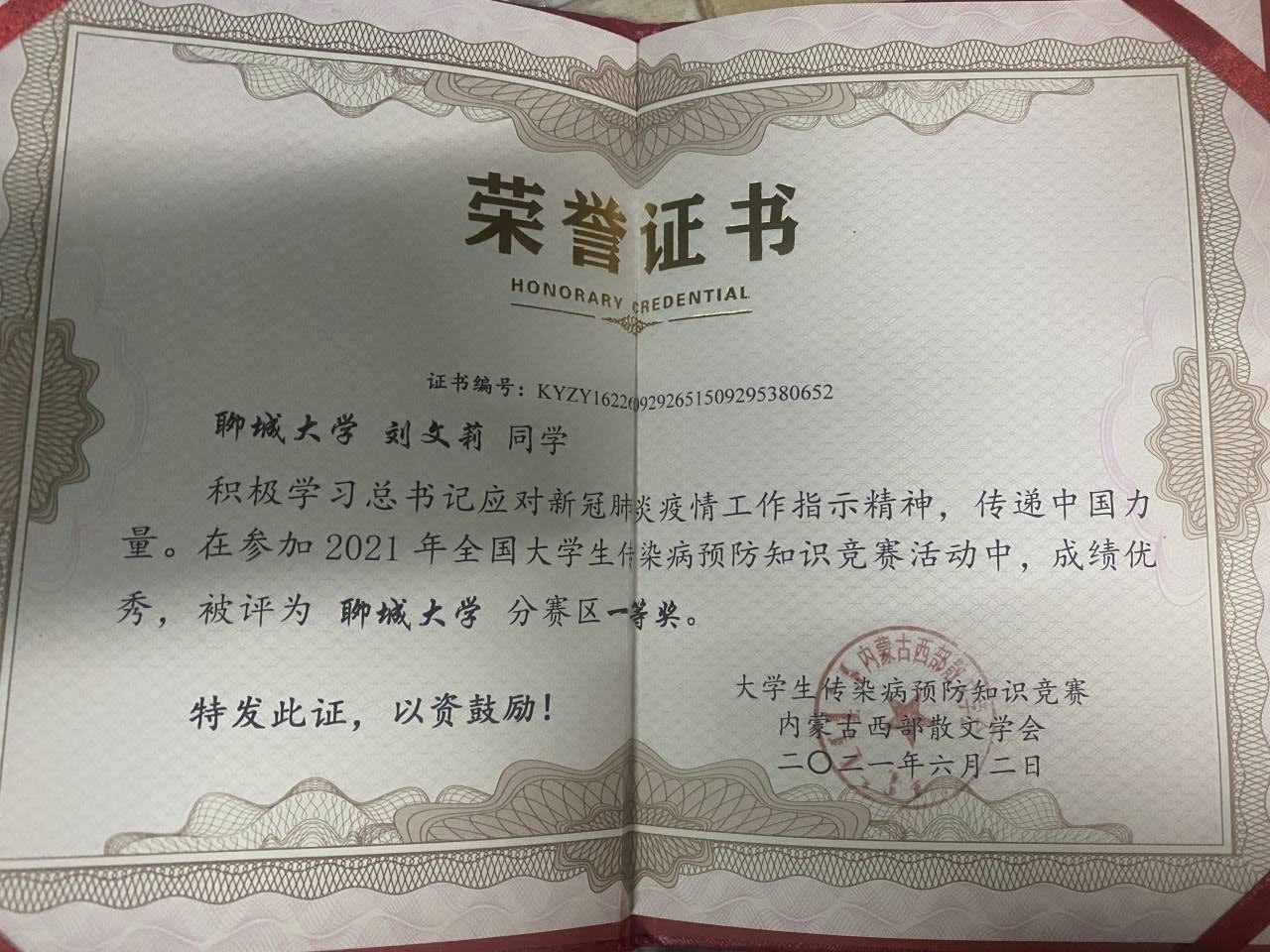热烈祝贺药学院刘文莉荣获大学生传染病预防知识竞赛一等奖