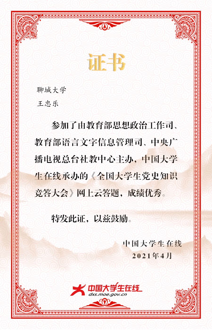 热烈祝贺药学院王忠乐荣获《全国大学生党史知识竞赛竞答大会》网上云答题活动证书