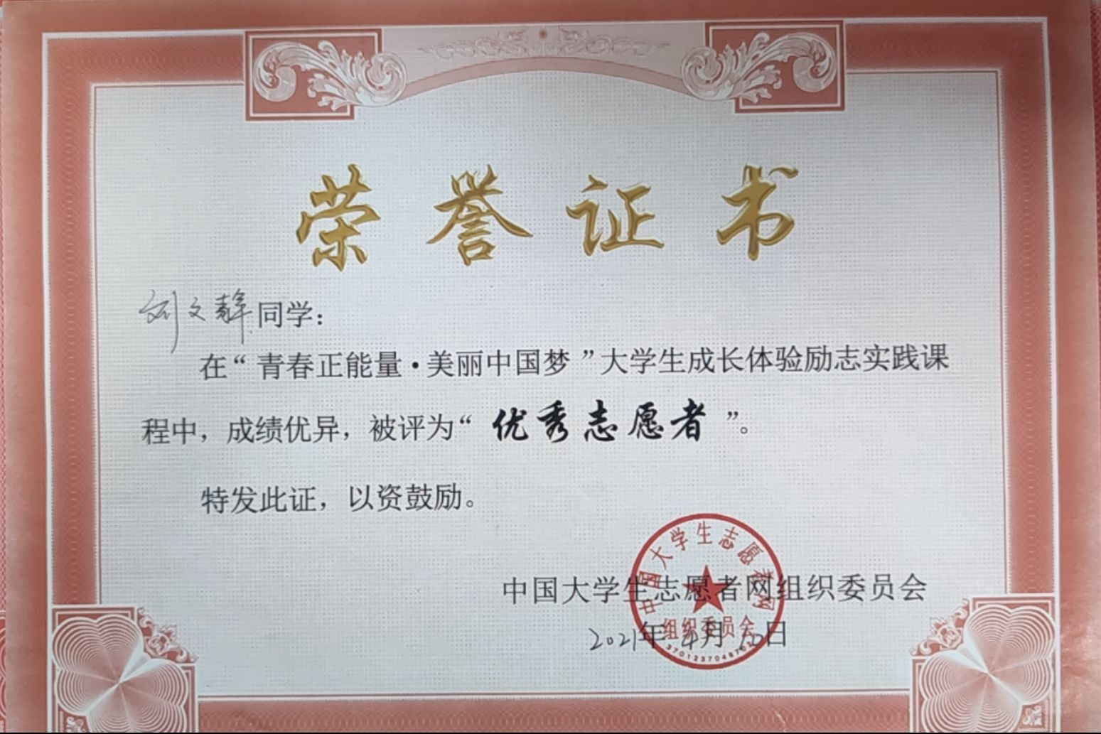 热烈祝贺药学院刘文静荣获 “青春正能量·美丽中国梦”大学生成长体验励志实践课程“优秀志愿者”